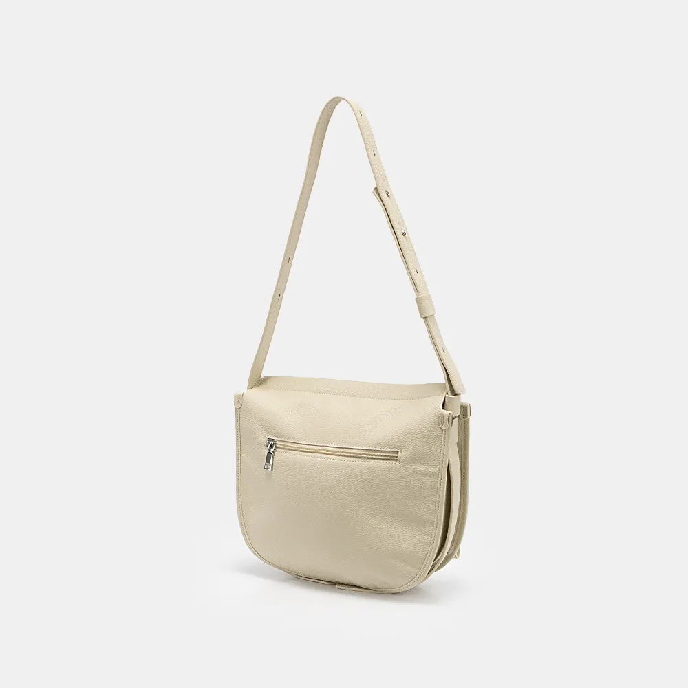 Сумка от торговой марки Poshete из натуральной кожи бежевого цвета. Модель с несъемным регулируемым плечевым ремнем на кобурных кнопках; в нижней части имеется шлевка для крепления ремня по низу. Отделение на скрытой молнии. Внутри: фирменная подкладка, карман на молнии, накладной карман. На задней стороне – карман на молнии.