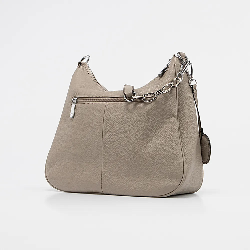 Сумка от торговой марки Poshete из натуральной кожи кофейного цвета. Модель среднего размера со съемной ручкой-цепочкой и съемным регулируемым плечевым ремнем. Отделение на молнии. Внутри: фирменная подкладка, средник и карман на молнии, накладной карман. На задней стороне – карман на молнии. В комплекте имеется съемным брелок с логотипом бренда.