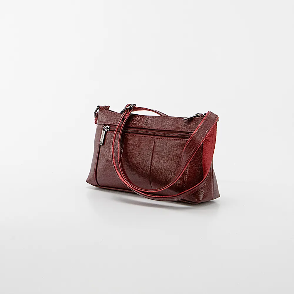 Сумка от торговой марки Valigetti из натуральной кожи винно-бордового цвета. Компактная модель со съемным регулируемым плечевым ремнем. Отделение на молнии. Внутри: фирменная подкладка, средник и карман на молнии. На лицевой стороне – два кармана на молнии. На задней стороне – карман на молнии.
