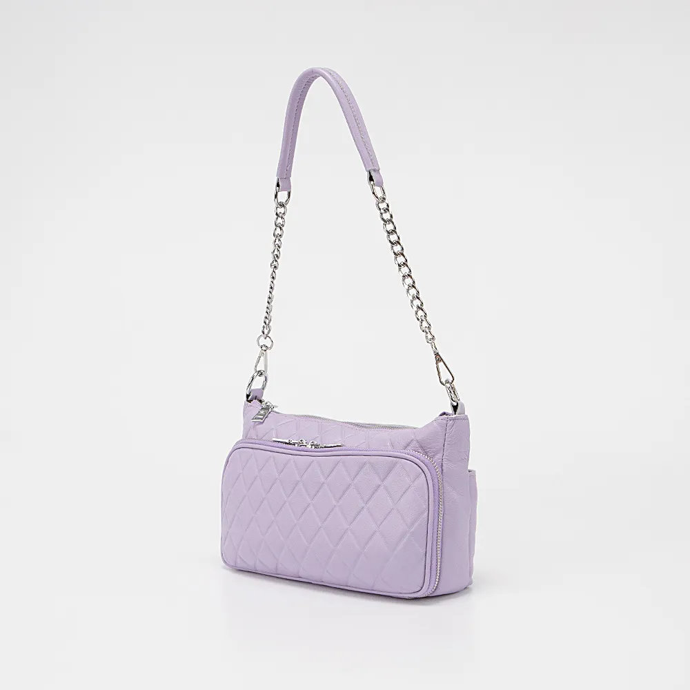 Сумка от торговой марки Poshete из натуральной кожи сиреневого цвета. Модель с удлиненной съемной ручкой-цепочкой, съемным регулируемым плечевым ремнем. Отделение на молнии. Внутри: фирменная подкладка, карман на молнии, накладной карман. На лицевой стороне – карман на молнии. На задней – вместительный накладной карман на молнии; внутри: перегородка с карманом на молнии. Задняя сторона декорирована ромбовидной стежкой.