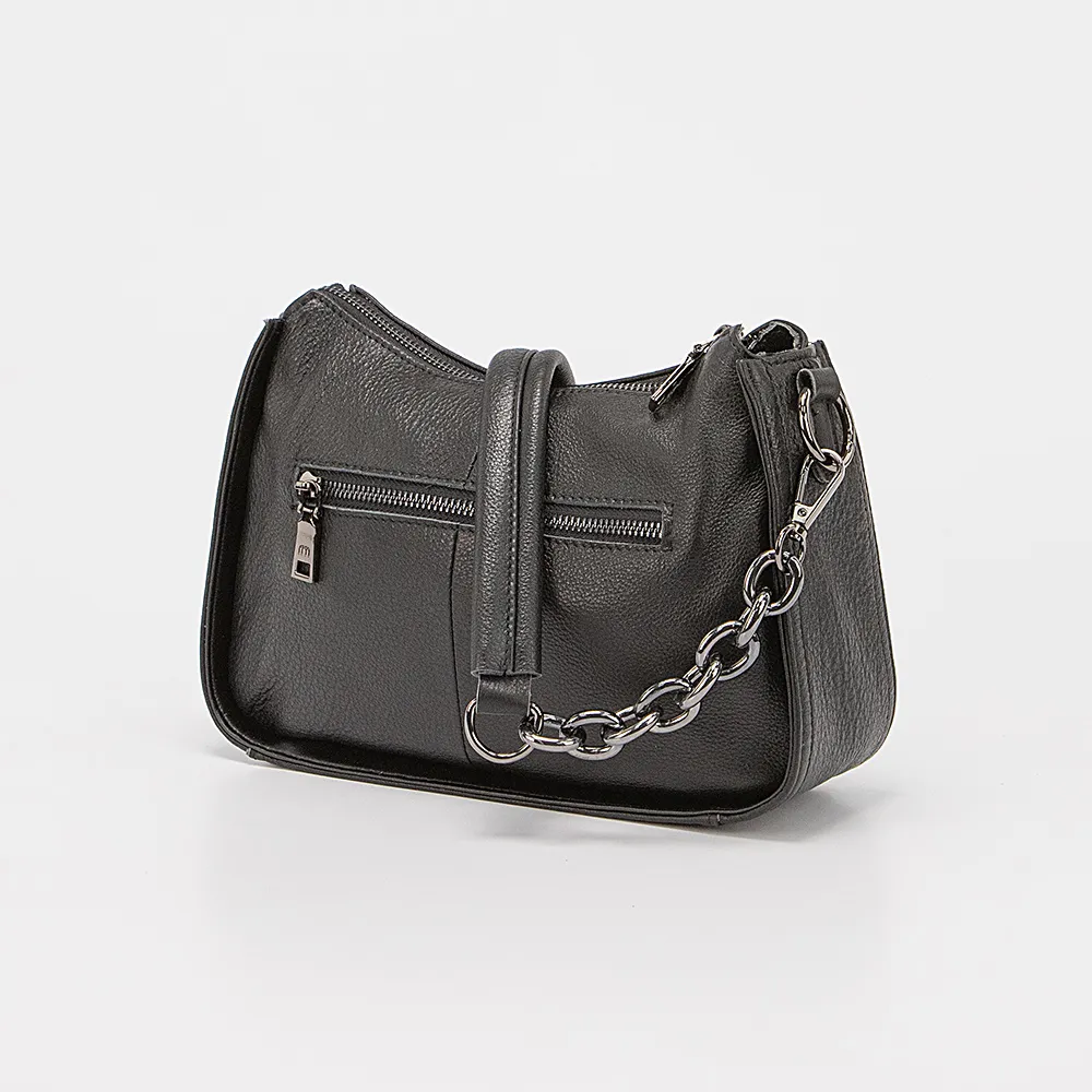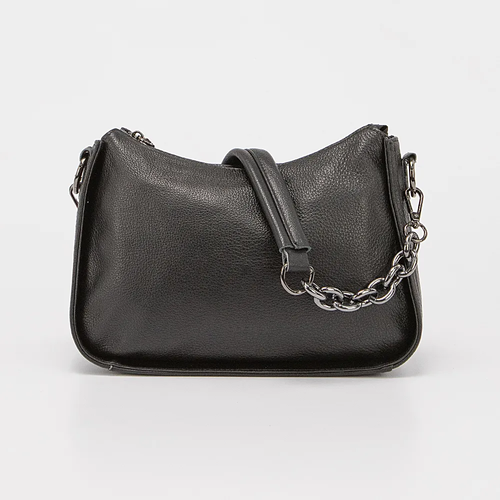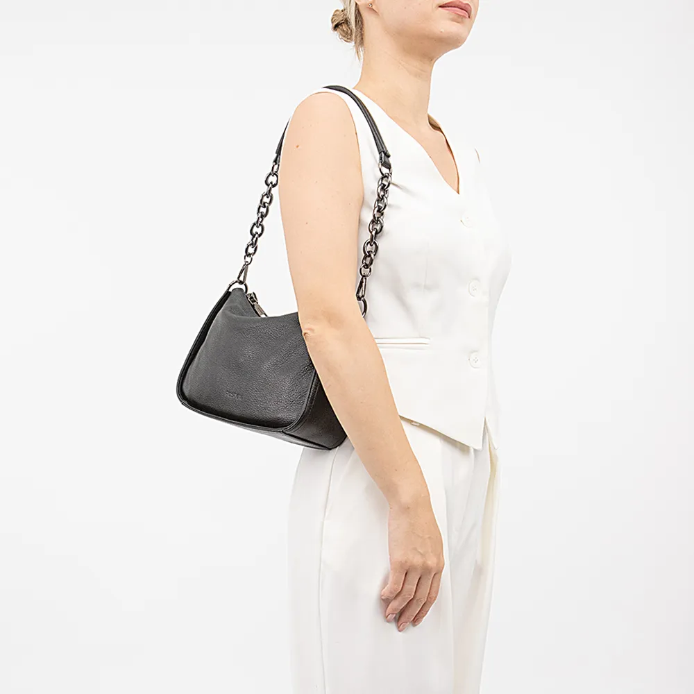 Сумка от торговой марки Poshete из натуральной кожи черного цвета. Компактная модель с удлиненной съемной ручкой-цепочкой. Внутри: фирменная подкладка, карман на молнии, накладной карман. На задней стороне – карман на молнии.