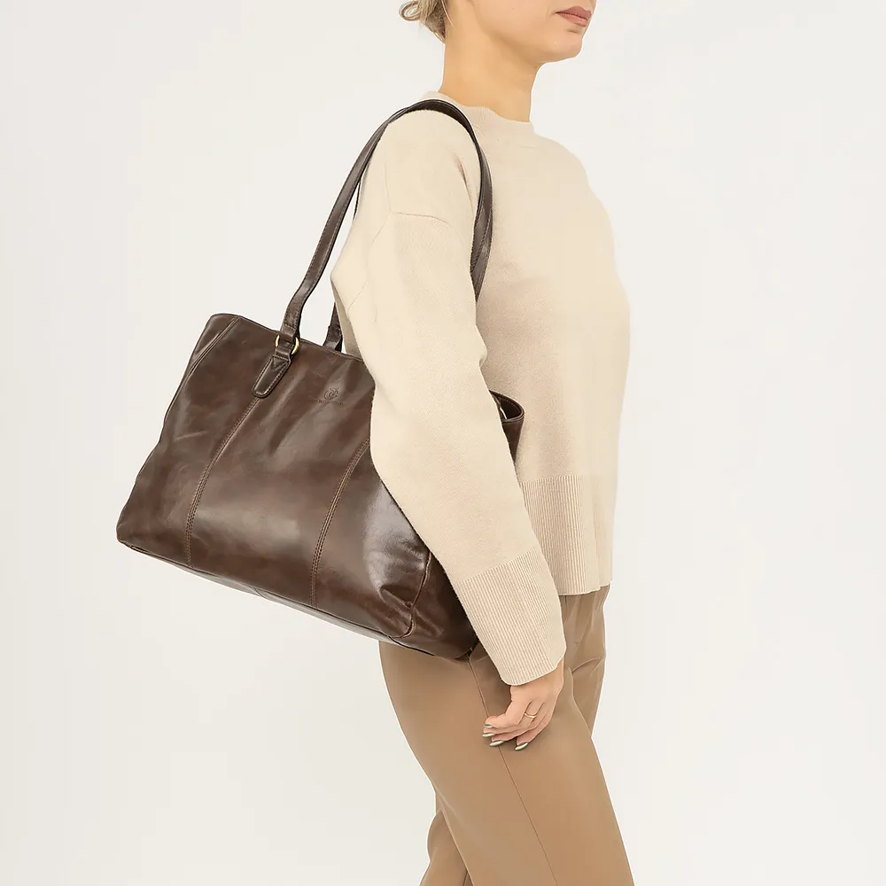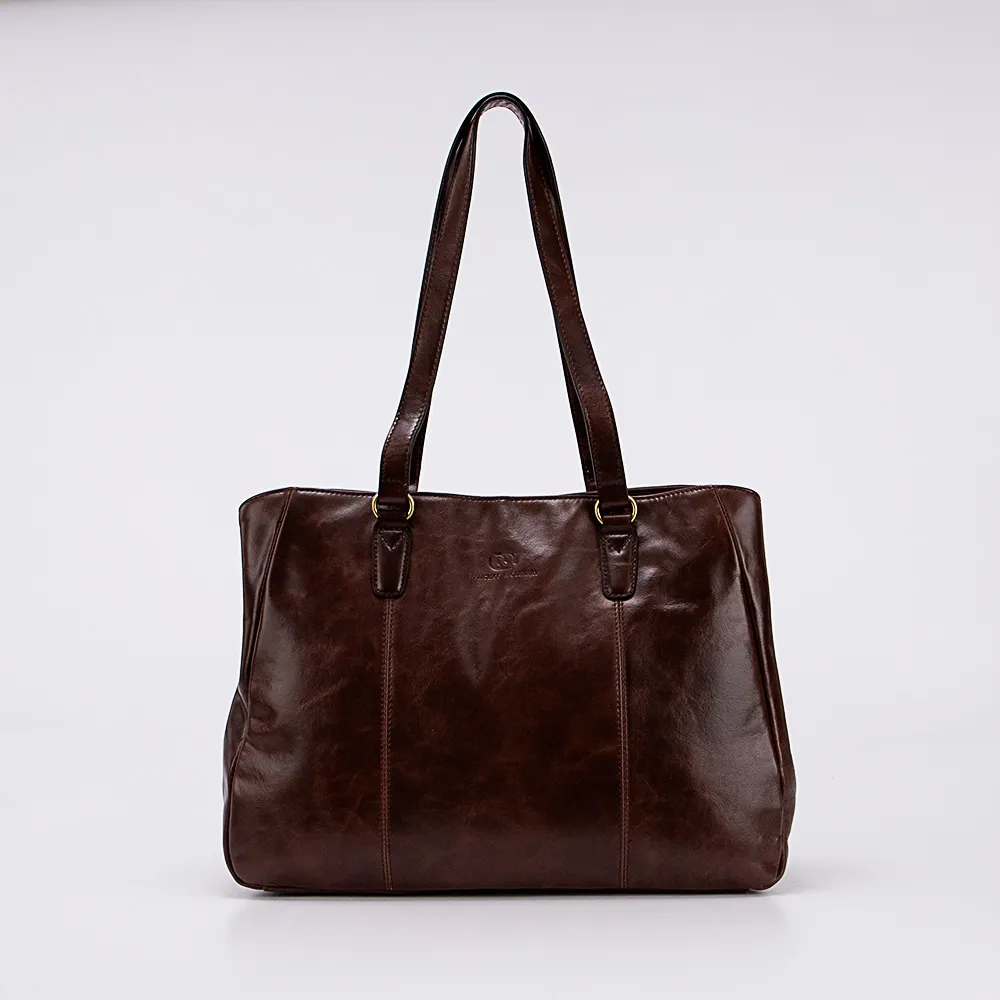 Сумка от торговой марки Francesco Molinary из натуральной кожи коричневого цвета. Вместительная модель с двумя удлиненными ручками. Три отделения на молнии, с фирменной подкладкой. Крайние фиксируются магнитной кнопкой. Среднее отделение на молнии; широко раскрывается, что обеспечивает удобный доступ. Внутри: карман на молнии. На задней стороне – карман на молнии.
