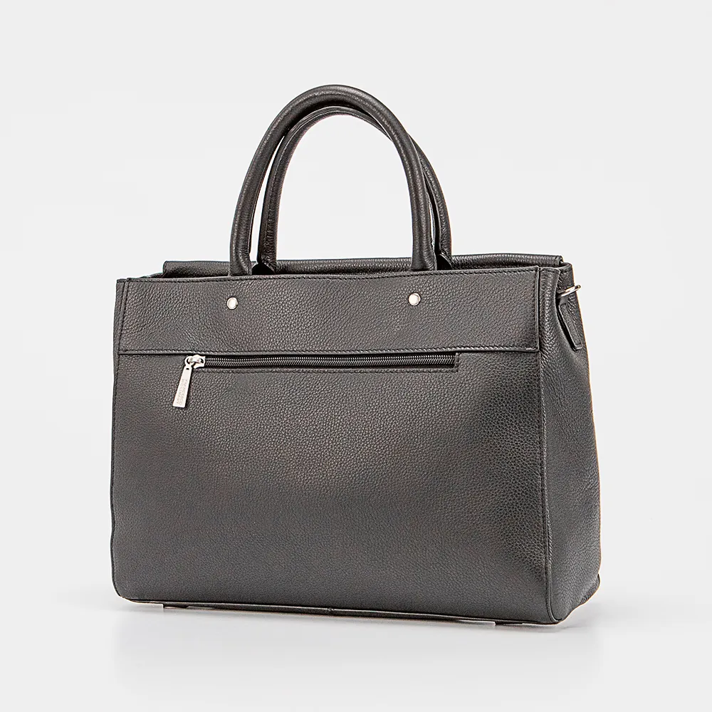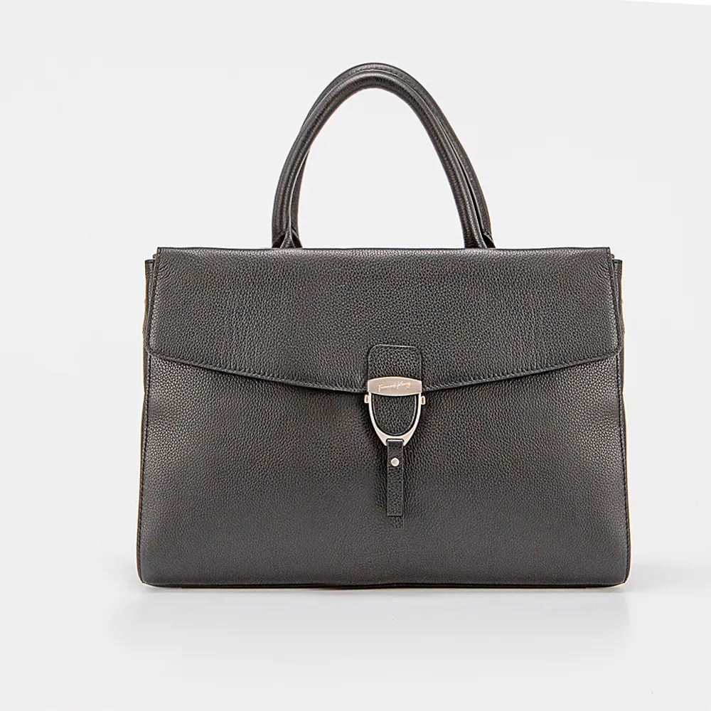 Сумка от торговой марки Francesco Molinary из натуральной кожи черного цвета. Модель с двумя ручками и съемным регулируемым плечевым ремнем. Клапан на магнитной кнопке закрывает карман на молнии и отделение на молнии. Внутри: средник и карман на молнии, накладной карман. Дно оснащено накладками для защиты от износа.