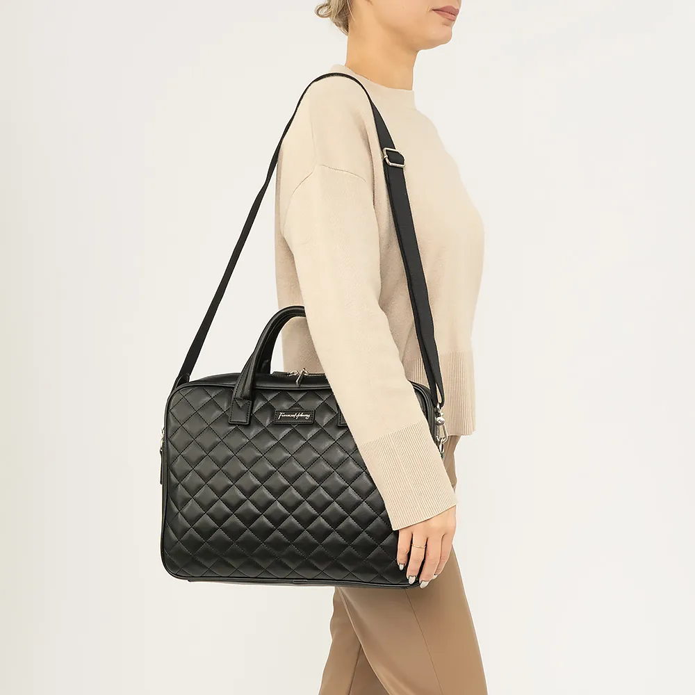 Сумка от торговой марки Francesco Molinary из натуральной кожи черного цвета. Лицевая сторона декорирована ромбовидной стежкой. Модель с двумя ручками и съемным регулируемым плечевым ремнем. Отделение на молнии; с уплотненными стенками. Внутри: фирменная подкладка, накладной карман с уплотненной стенкой для ноутбука, карман на молнии, органайзер. На задней стороне – вместительный карман на молнии.