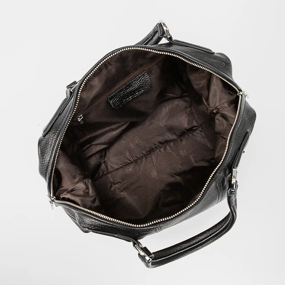 Сумка от торговой марки Poshete из натуральной кожи черного цвета. Модель боулер с двумя ручками, съемным регулируемым плечевым ремнем. Отделение на молнии. Внутри: фирменная подкладка, карман на молнии. На задней стороне – карман на молнии. Дно оснащено металлическими ножками для защиты от износа.