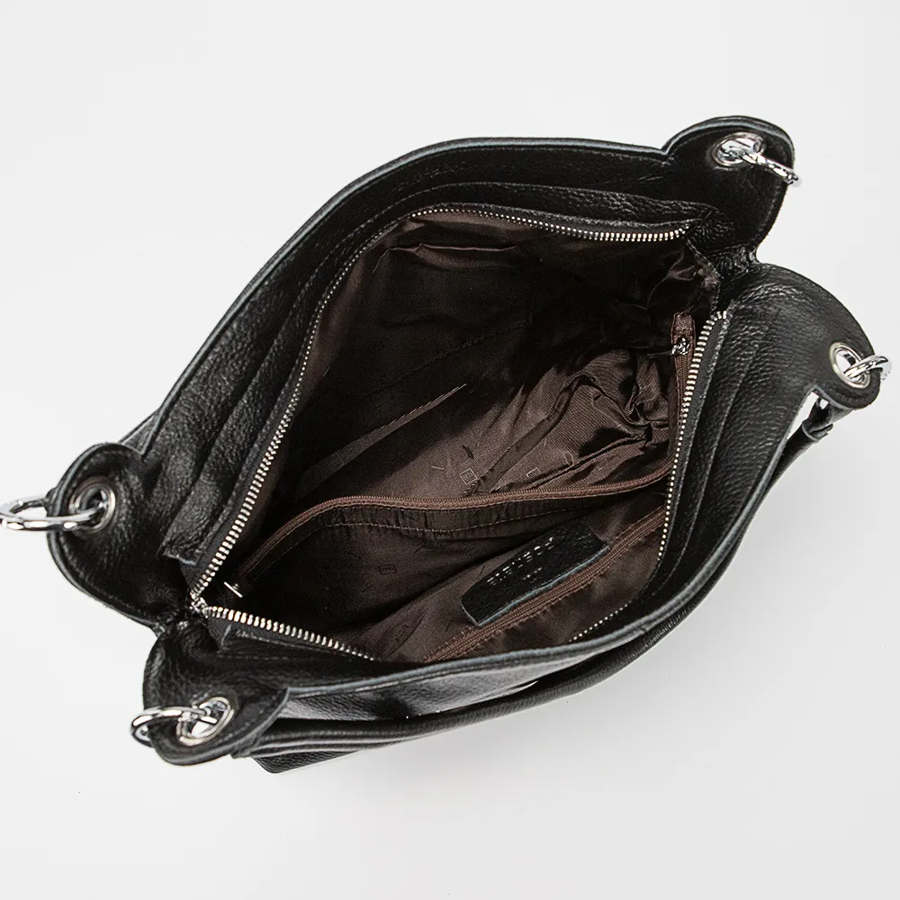 Сумка от торговой марки Poshete из натуральной кожи черного цвета. Вместительная модель с двумя ручками на кольцах в люверсах. Отделение на молнии. Внутри: фирменная подкладка, средник и карман на молнии, накладной карман. На задней стороне – карман на молнии. Дно оснащено металлическими ножками для защиты от износа. Подойдет для документов формата А4.