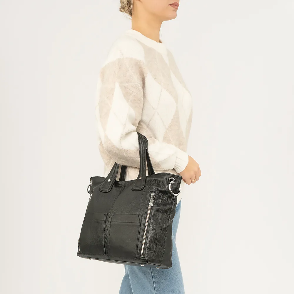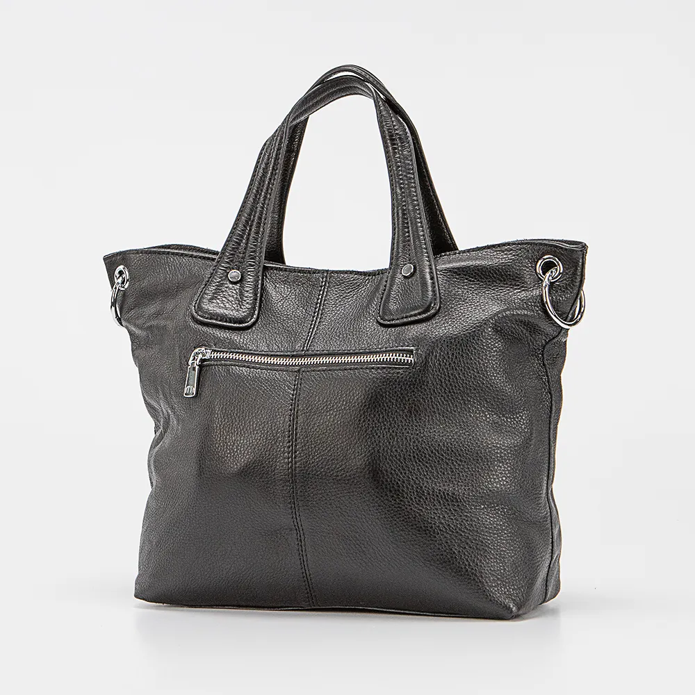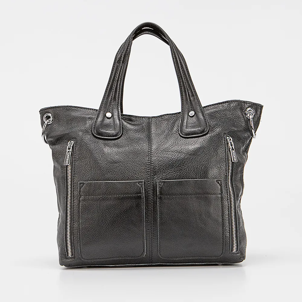 Сумка от торговой марки Poshete из натуральной кожи черного цвета. Модель с двумя ручками, съемным регулируемым плечевым ремнем, выполненным из текстильного материала. Отделение на молнии. Внутри: текстильная подкладка, средник и карман на молнии, накладной карман. На лицевой стороне – два вертикальных карман на молнии, два накладных кармана без застежки. На задней стороне – карман на молнии. Дно сумки оснащено металлическими ножками от износа.