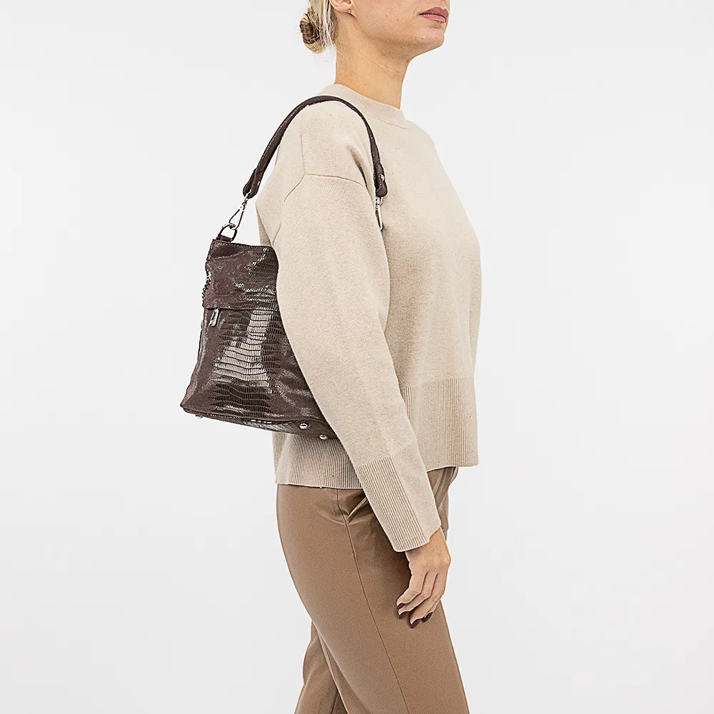 Сумка от торговой марки Poshete выполнена из мягкой натуральной кожи коричневого цвета с лазерной обработкой. Декорирована оригинальным принтом под змеиную кожу и подвесками-кисточками на цепочках по бокам. Модель со съемной ручкой и съемным регулируемым плечевым ремнем. Отделение на молнии. Внутри: фирменная подкладка, средник и карман на молнии, два накладных кармана. На лицевой и задней сторонах – карман на молнии. Овальное дно оснащено металлическими ножками для защиты от износа.