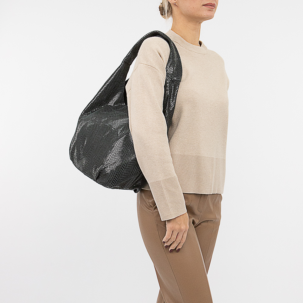 Сумка от торговой марки Poshete выполнена из натуральной кожи серого цвета с эффектной лазерной обработкой и тиснением под рептилию. Модель хобо с одной ручкой, являющейся продолжением сумки. Отделение на молнии. Внутри: фирменная подкладка, перегородка и карман на молнии, два накладных кармана. На задней стороне – карман на молнии. Дно овальной формы.