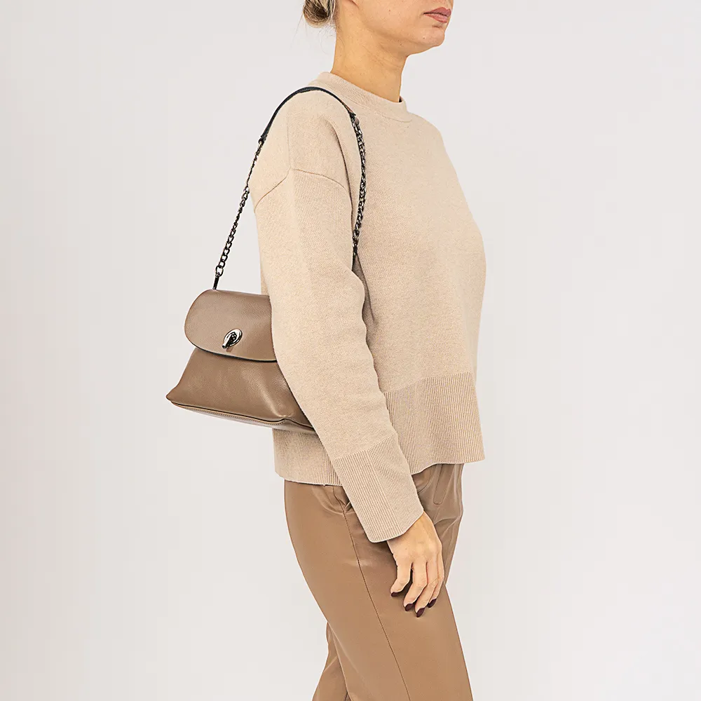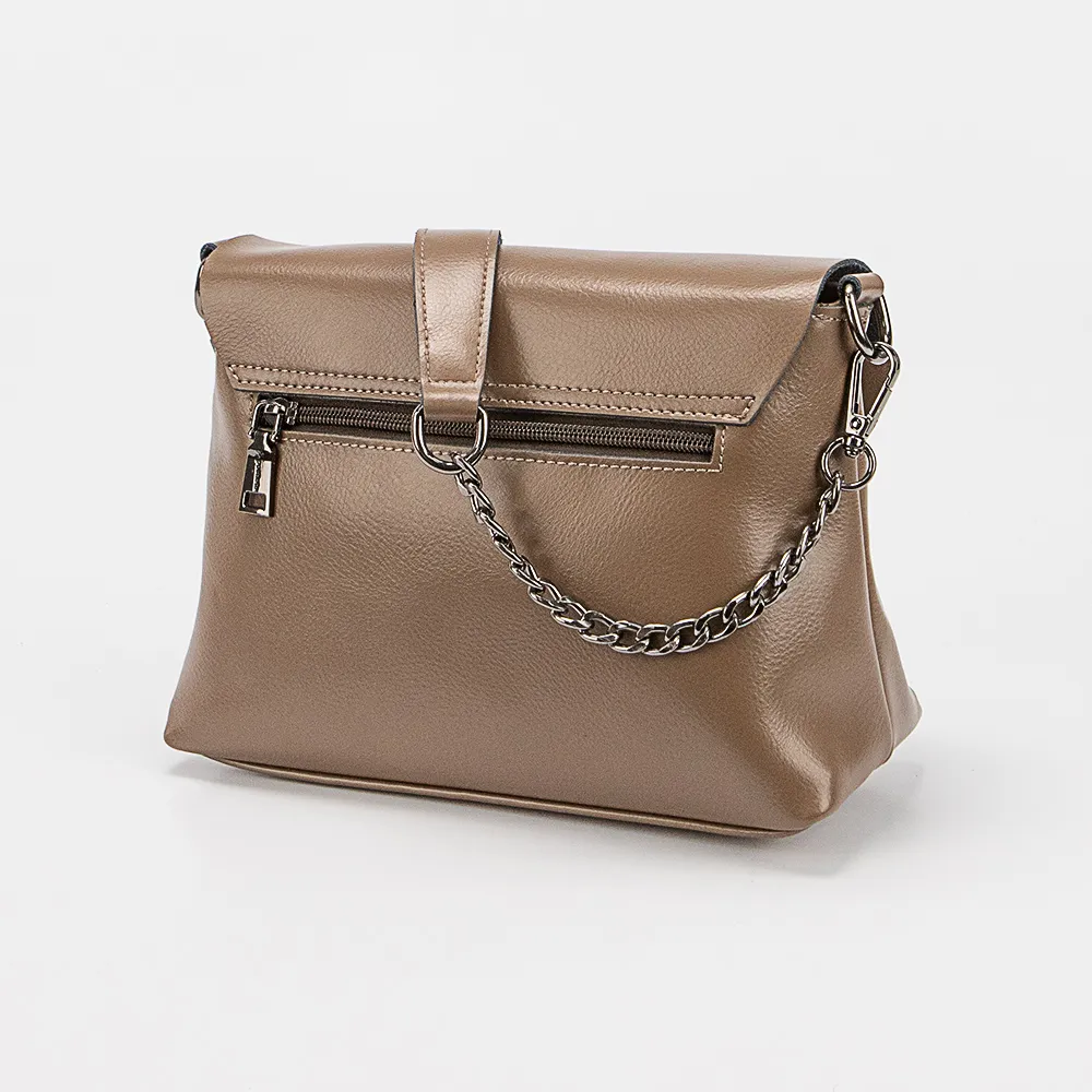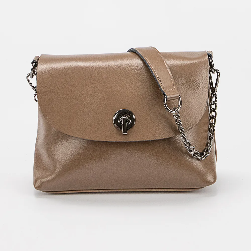 Сумка от торговой марки Valigetti из натуральной кожи кофейного цвета. Модель с удлиненной съемной ручкой-цепочкой и съемным регулируемым плечевым ремнем. Закрывается клапаном на откидном замке. Отделение на молнии. Внутри: текстильная подкладка, средник и карман на молнии, накладной карман. На задней стороне – карман на молнии.