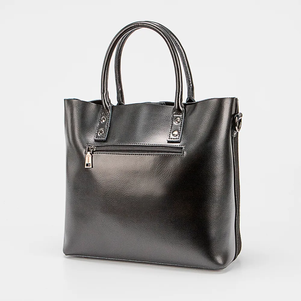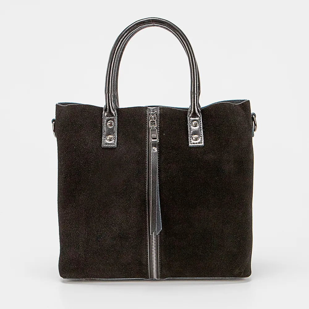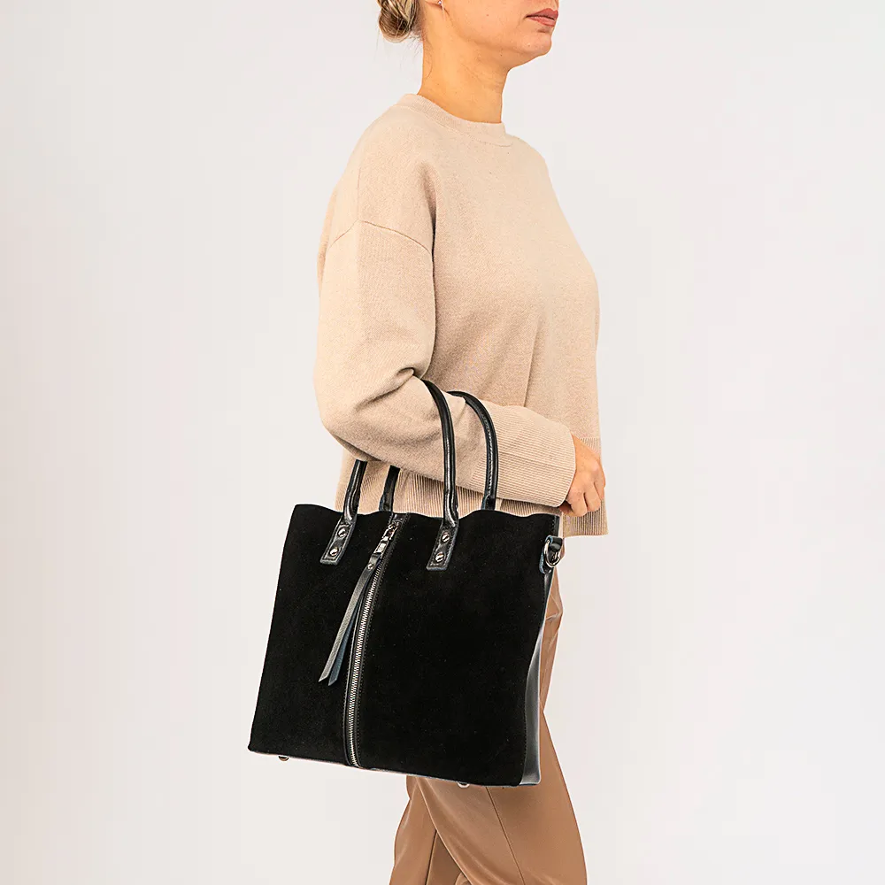Сумка от торговой марки Poshete из натуральной кожи и замши черного цвета. Модель с двумя ручками и съемным регулируемым плечевым ремнем. Отделение на молнии. Внутри: фирменная подкладка, средник и карман на молнии. На лицевой и задней сторонах – карман на молнии. Дно сумки оснащено металлическими ножками для защиты от износа.