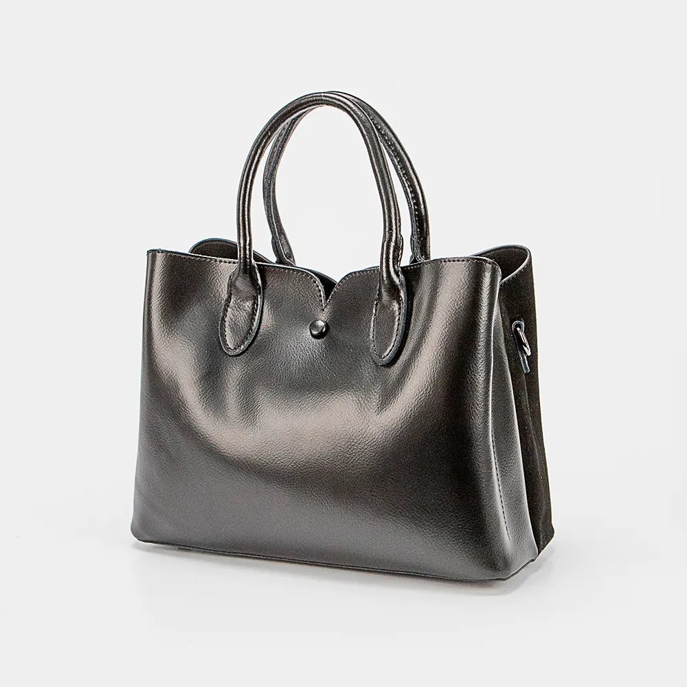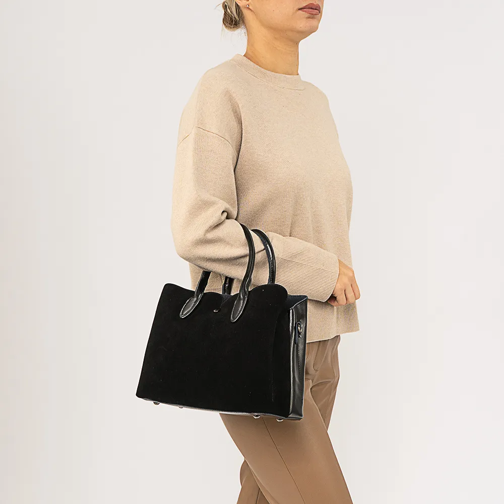 Сумка от торговой марки Poshete из натуральной кожи и замши черного цвета. Модель с фигурным верхом, двумя ручками и съемным регулируемым плечевым ремнем. Три отделения с частичной текстильной подкладкой. Крайние отделения фиксируются магнитной кнопкой. Отделение на молнии. Внутри: карман на молнии, накладной карман. Дно оснащено металлическими ножками для защиты от износа.