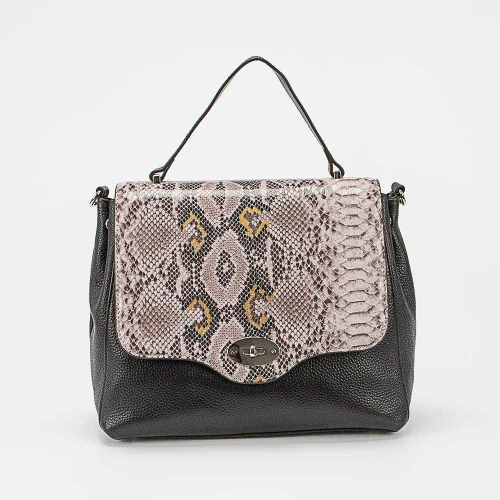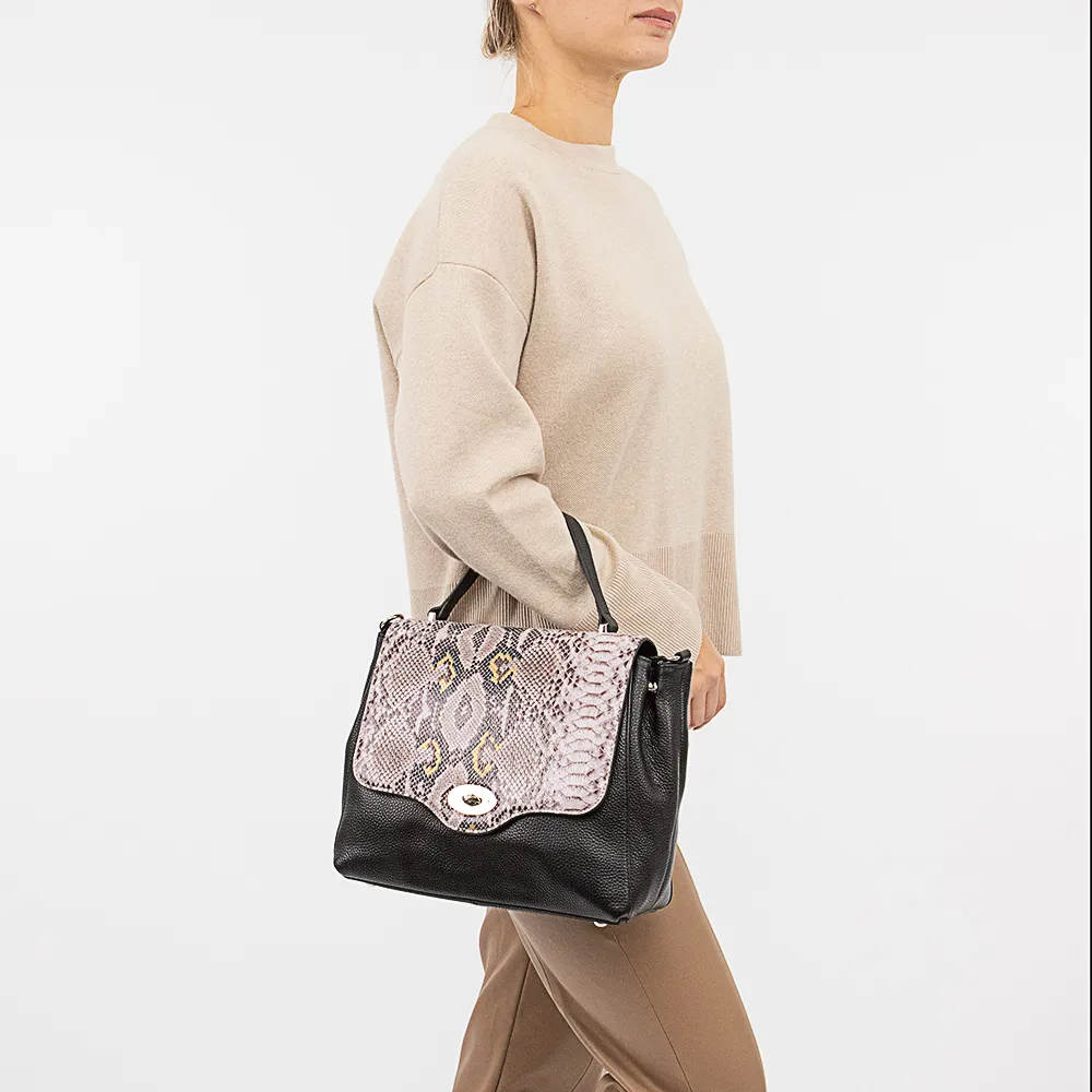Сумка от торговой марки Poshete из натуральной кожи черного цвета. Модель с одной ручкой и съемным регулируемым плечевым ремнем. Закрывается фигурным клапаном на поворотном замке. Клапан декорирован эффектным тиснением под змеиную кожу. Отделение на молнии. Внутри: фирменная подкладка, средник и карман на молнии, накладной карман. На задней стороне – карман на молнии. Дно оснащено металлическими ножками для защиты от износа.