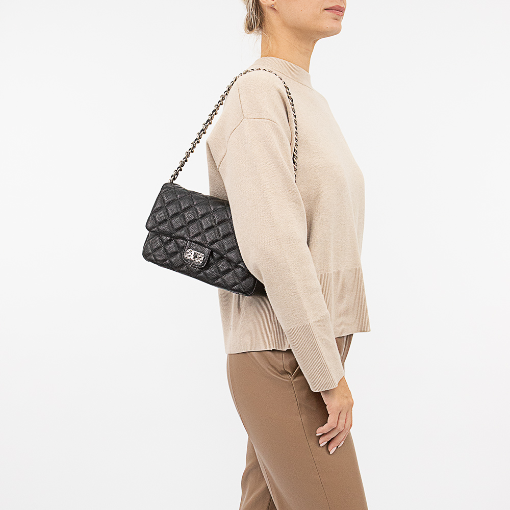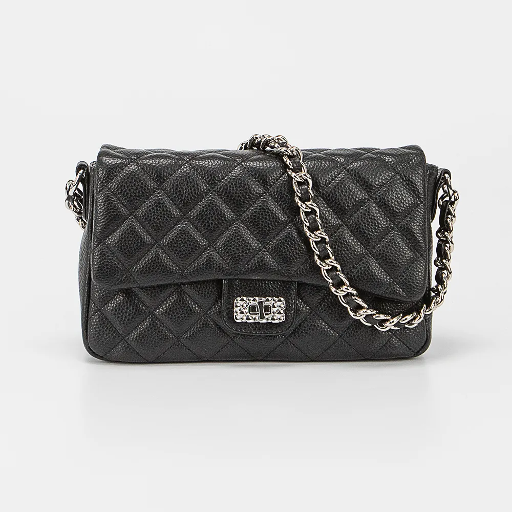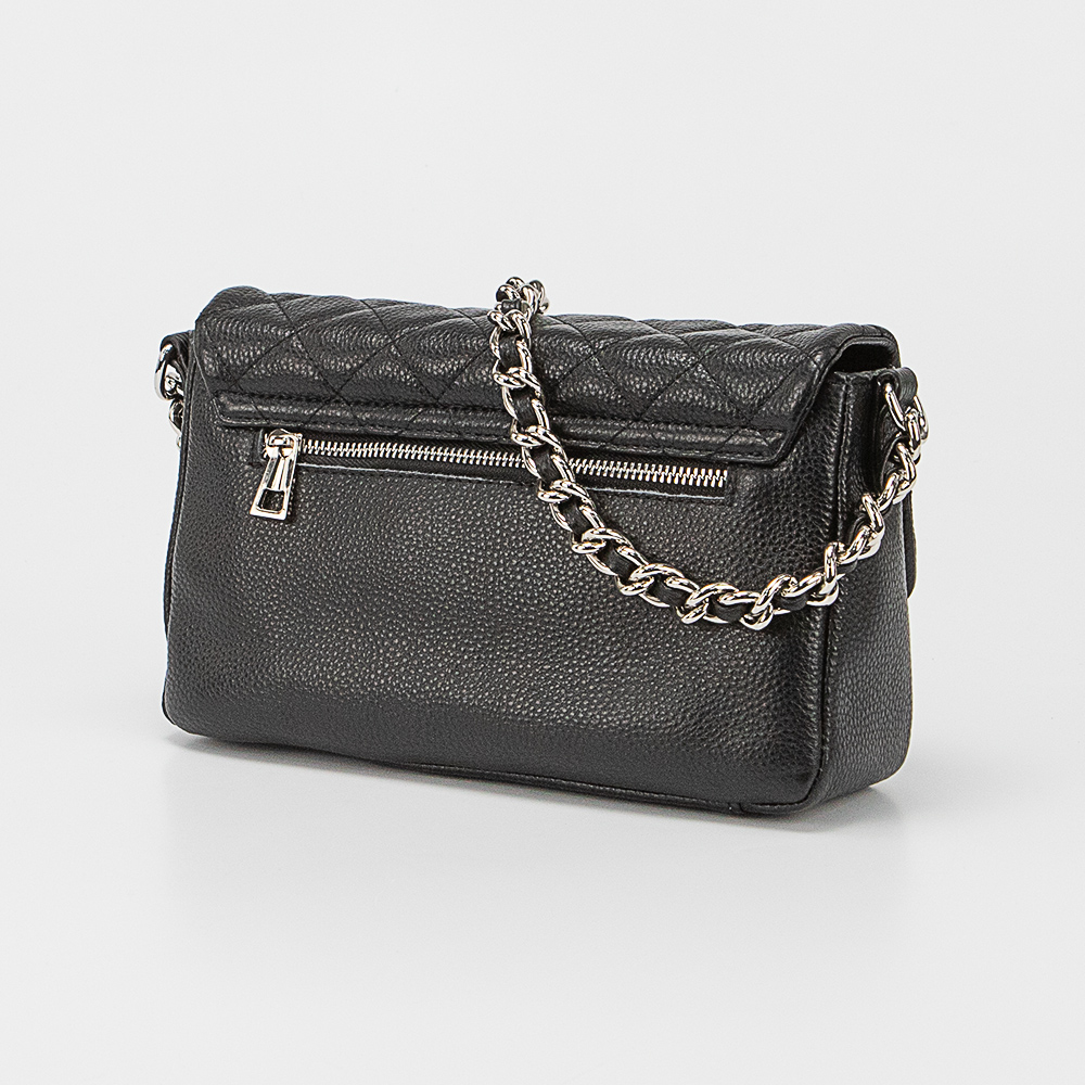 Сумка от торговой марки Poshete из натуральной кожи черного цвета. Декорирована ромбовидной стежкой. Модель с ручкой-цепочкой и съемным регулируемым плечевым ремнем. Закрывается фигурным клапаном на поворотном замке с оригинальным декором. Отделение на молнии. Внутри: фирменная подкладка, средник и карман на молнии, накладной карман. На задней стороне – карман на молнии.