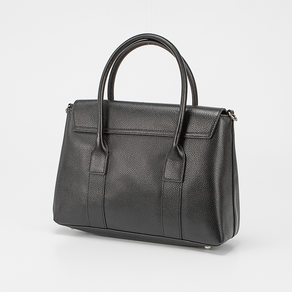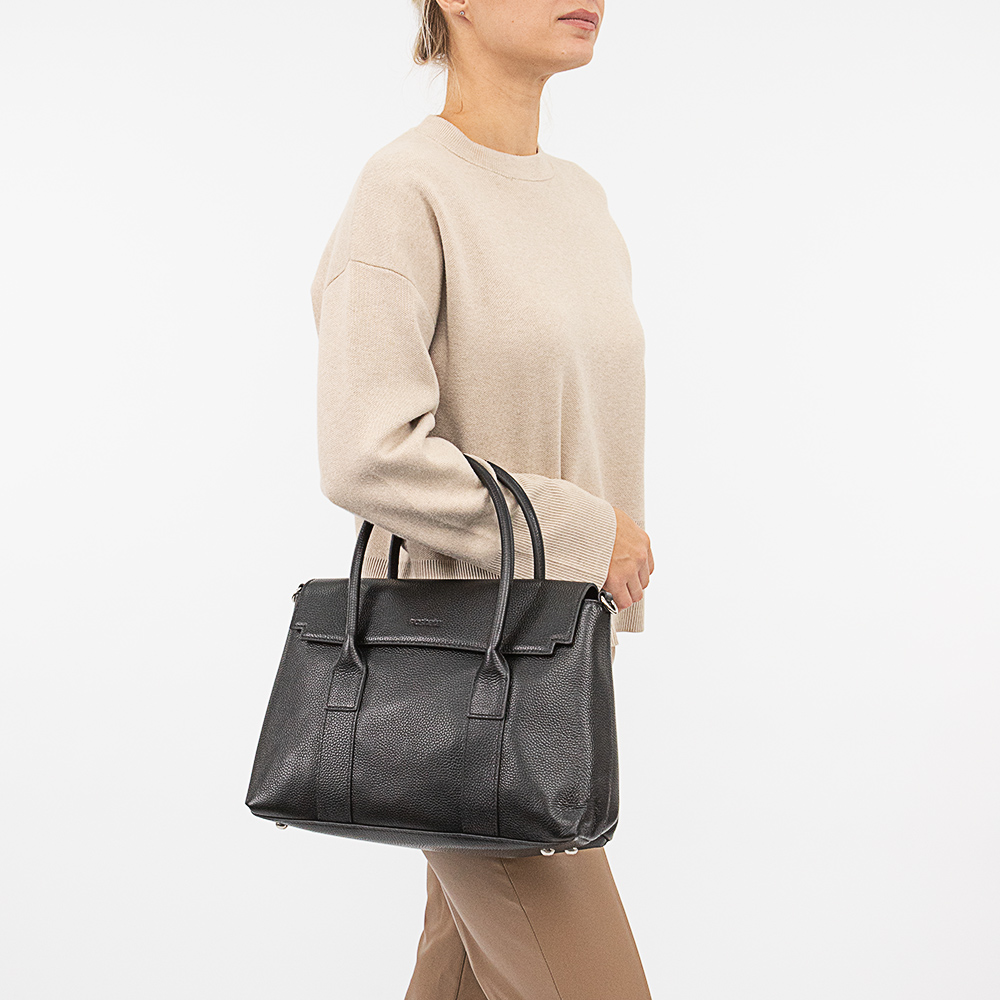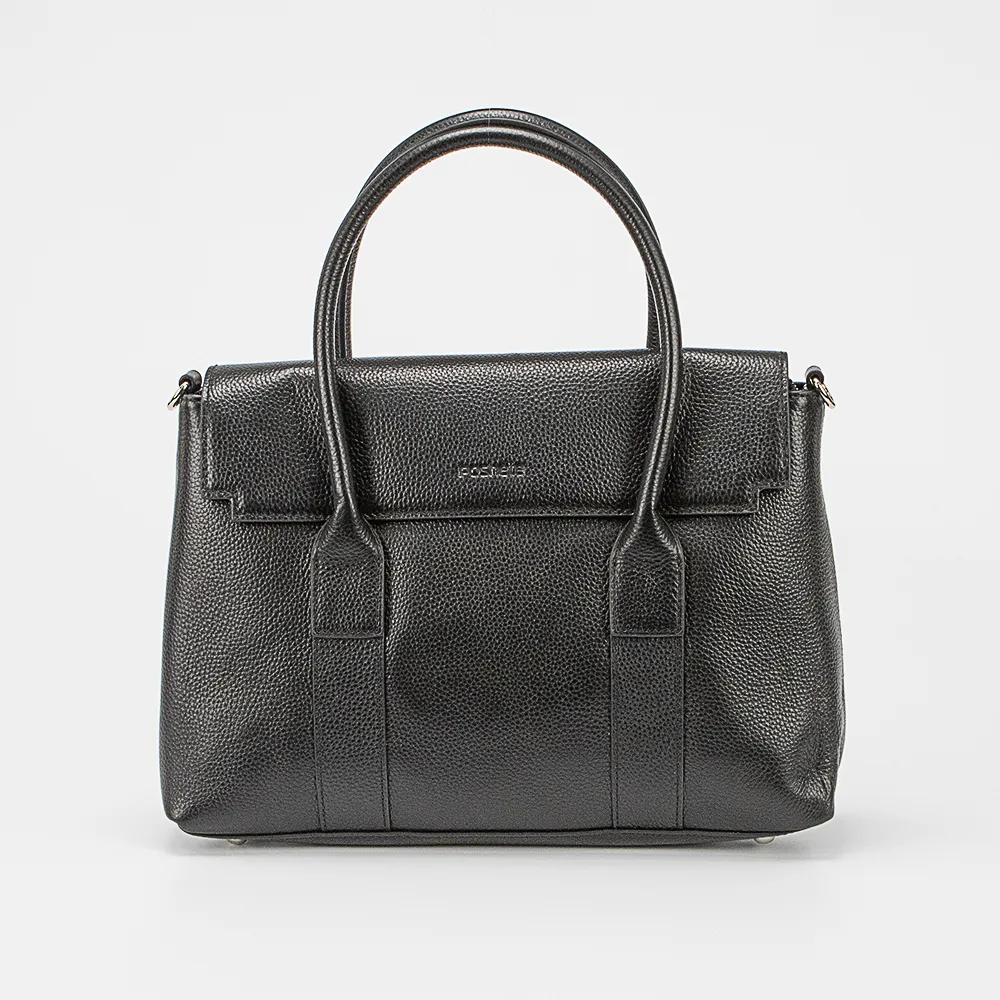 Сумка от торговой марки Poshete из натуральной кожи черного цвета. Модель с двумя плотными ручками и съемным регулируемым плечевым ремнем. Закрывается коротким клапаном на двух магнитных кнопках. Отделение на молнии. Внутри: фирменная подкладка, средник и карман на молнии, накладной карман. Дно оснащено металлическими ножками для защиты от износа.