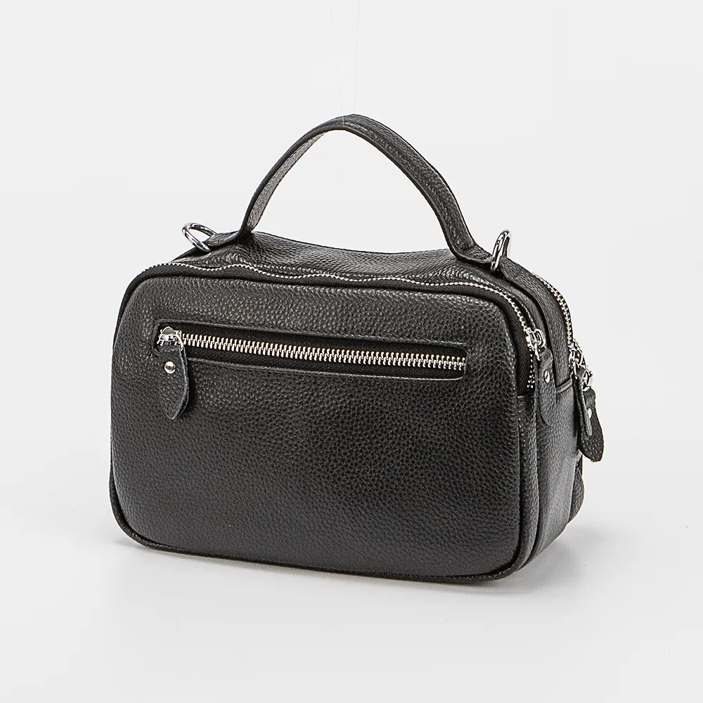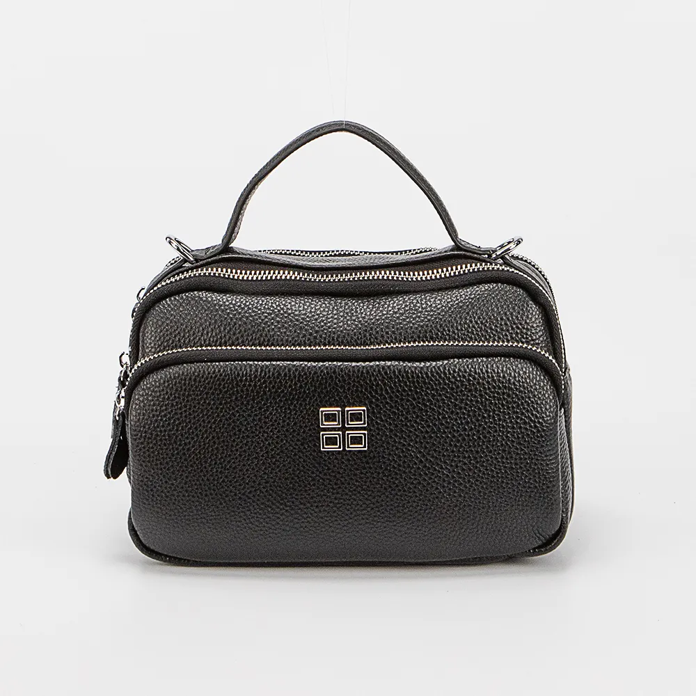 Сумка от торговой марки Poshete из натуральной кожи черного цвета. Компактная модель с одной ручкой и съемным регулируемым плечевым ремнем. Два отделения на молнии, с текстильной подкладкой. В одном из них – карман на молнии, в другом – накладной карман. На лицевой и задней сторонах – карман на молнии.