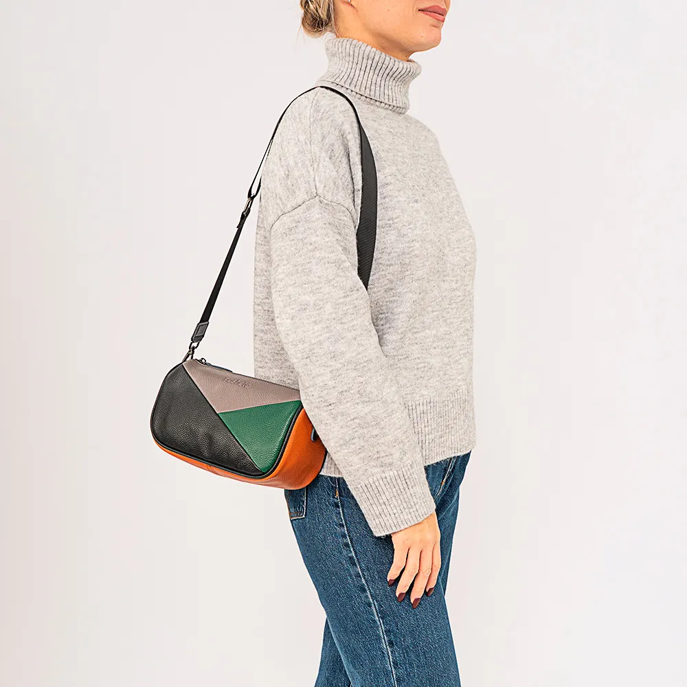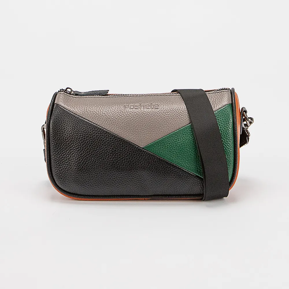Сумка от торговой марки Poshete из натуральной кожи с разноцветными вставками. Модель с широким съемным регулируемым плечевым ремнем, выполненным из текстильного материала. Отделение на молнии. Внутри: текстильная подкладка, карман на молнии, накладной карман. На задней стороне – карман на молнии.