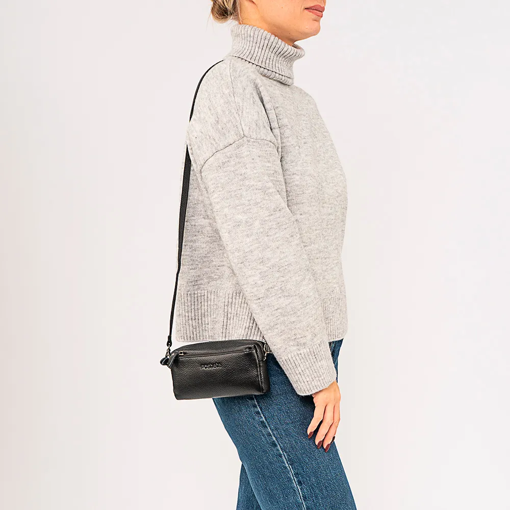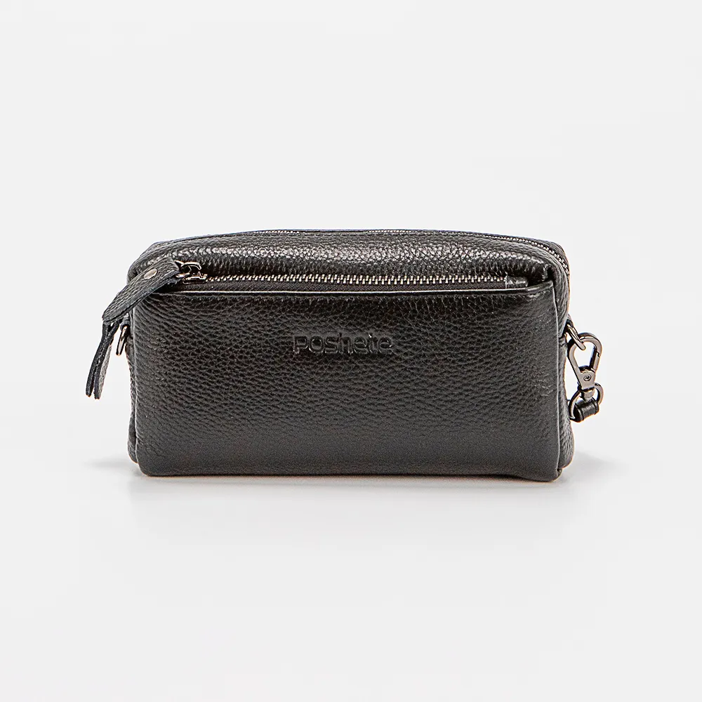 Сумка кросс-боди от торговой марки Poshete из натуральной кожи черного цвета. Компактная модель со съемным регулируемым плечевым ремнем и съемным ремешком для запястья. Отделение на молнии. Внутри: карман на молнии. На лицевой и задней сторонах – карман на молнии.