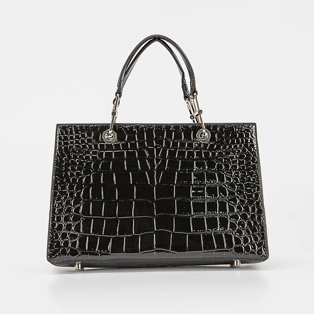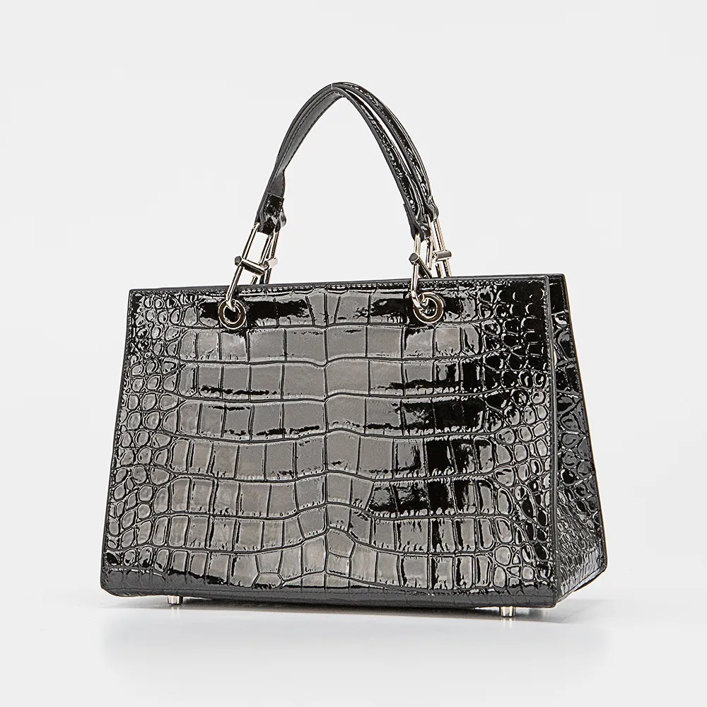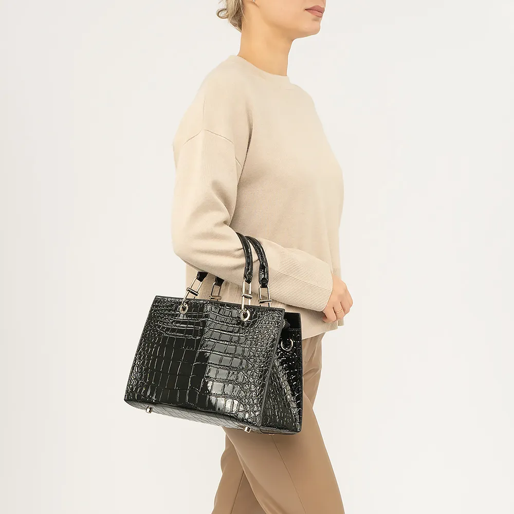 Сумка от торговой марки Valigetti из натуральной лакированной кожи черного цвета с тиснением под крокодила. Модель с двумя плотными ручками, съемным регулируемым плечевым ремнем. Отделение на молнии. Внутри: фирменная подкладка, карман на молнии, накладной карман, перегородка с карманом на молнии, образующая накладной карман. Дно оснащено металлическими ножками для защиты от износа.