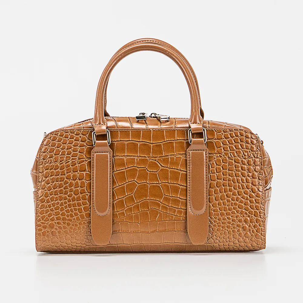 Сумка от торговой марки Valigetti из натуральной кожи коричневого цвета с тиснением под крокодила. Модель с двумя плотными ручками, съемным регулируемым плечевым ремнем. Отделение на молнии. Внутри: фирменная подкладка, карман на молнии, накладной карман.