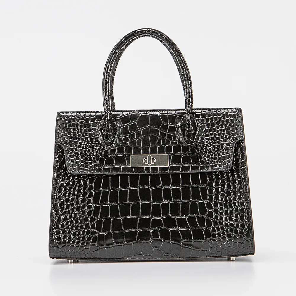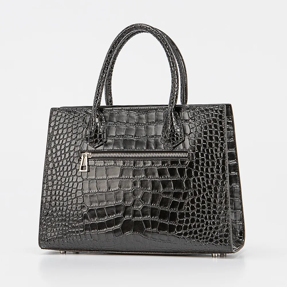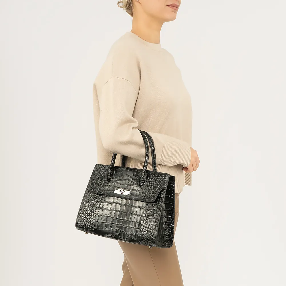 Сумка от торговой марки Valigetti из натуральной лакированной кожи черного цвета с тиснением под крокодила. Модель с двумя плотными ручками, съемным регулируемым плечевым ремнем. Отделение на молнии. Внутри: фирменная подкладка, средник и карман на молнии, накладной карман. Дно оснащено металлическими ножками для защиты от износа.