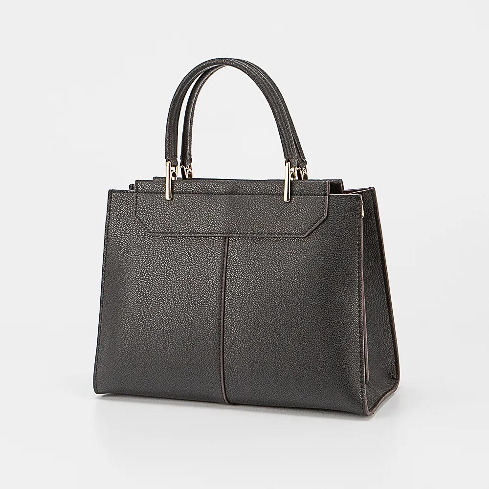 Сумка от торговой марки Poshete из натуральной кожи черного цвета. Модель с двумя ручками и съемным регулируемым плечевым ремнем. Три отделения с фирменной подкладкой. Крайние фиксируются магнитной кнопкой. Основное отделение на молнии. Внутри: карман на молнии и накладной карман, кожаная перегородка образует два отсека. На дне имеются кожаные накладки для защиты от износа.