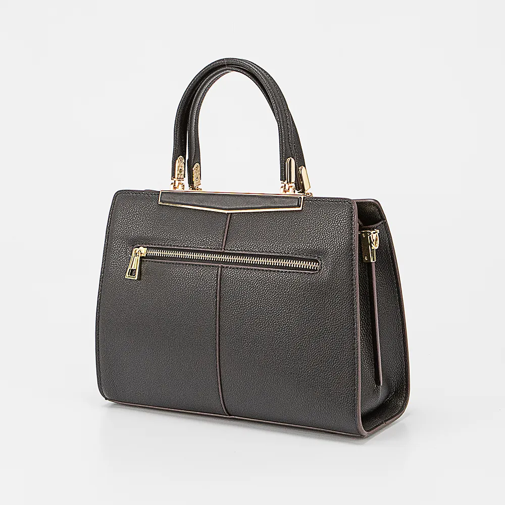 Сумка от торговой марки Poshete из натуральной кожи черного цвета. Модель с двумя ручками и съемным регулируемым плечевым ремнем. Отделение на молнии. Внутри: фирменная подкладка, средник и карман на молнии, накладной карман. На задней стороне – карман на молнии. На дне имеются кожаные накладки для защиты от износа.