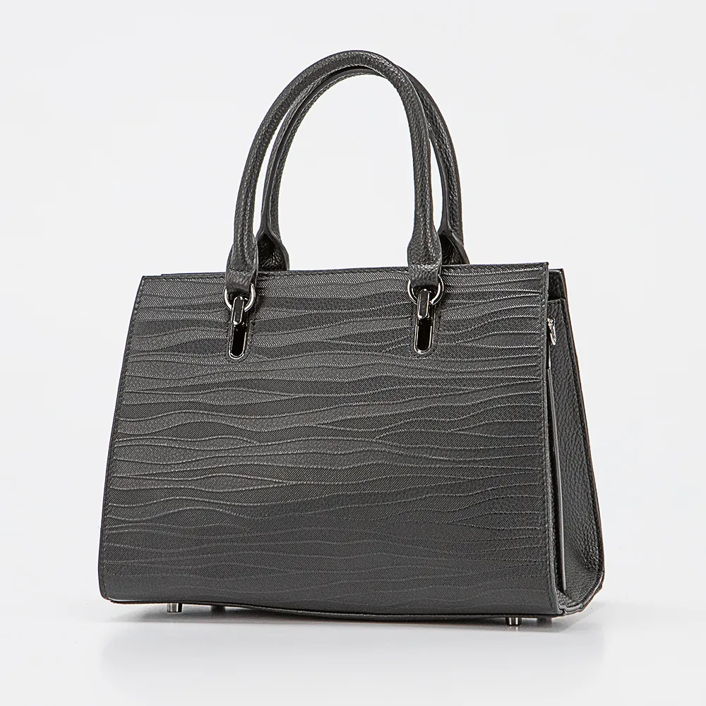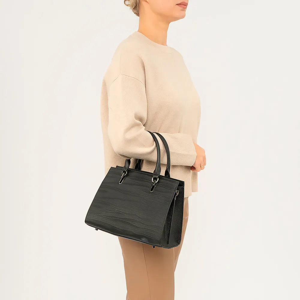 Сумка от торговой марки Poshete из натуральной кожи черного цвета с оригинальным узорным тиснением. Модель с двумя плотными ручками и съемным регулируемым плечевым ремнем. Основное отделение на молнии. Внутри: средник и карман на молнии. Дно оснащено металлическими ножками для защиты от износа.