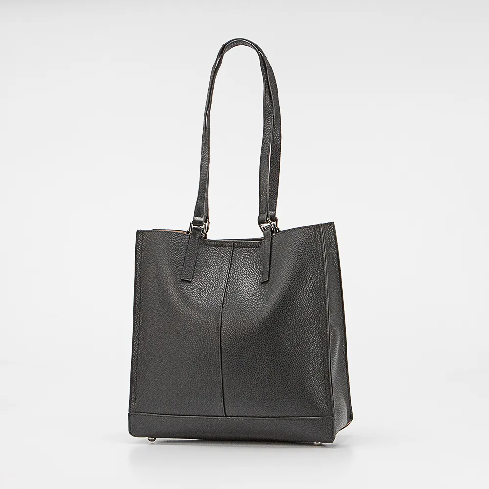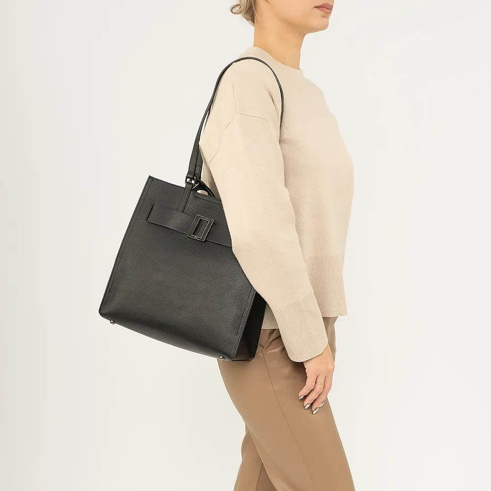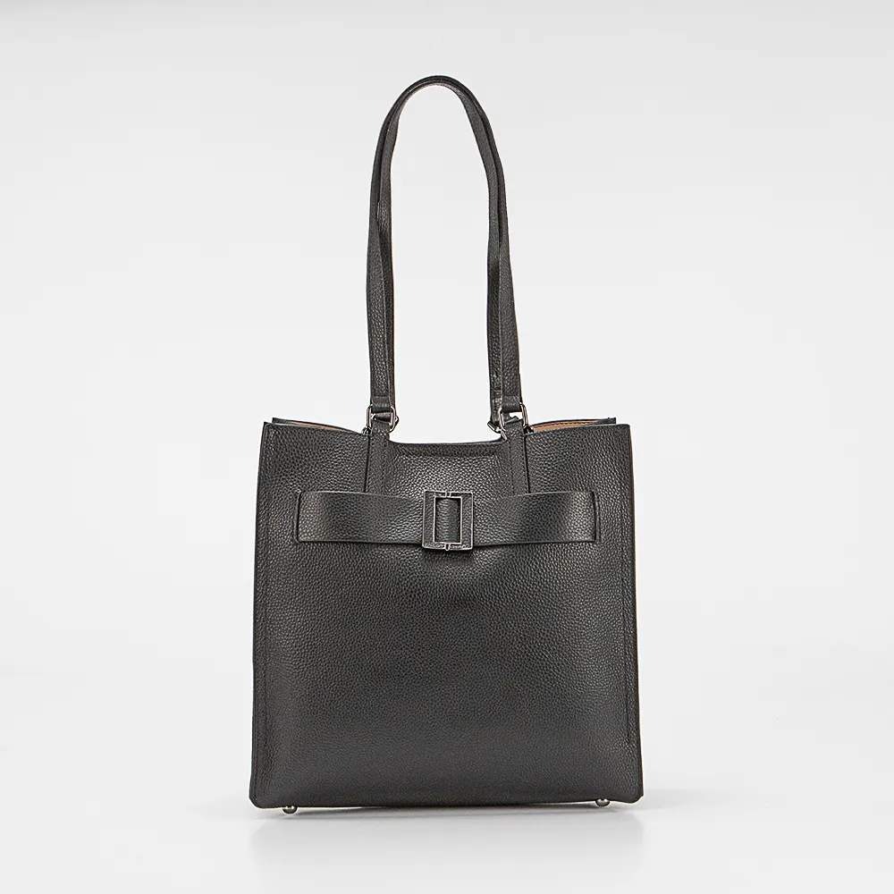 Сумка от торговой марки Poshete из натуральной кожи черного цвета. Лицевая сторона декорирована ремешком с пряжкой. Модель с двумя удлиненными ручками. Три отделения; крайние фиксируются магнитной кнопкой. Среднее отделение на молнии; внутри: карман на молнии, накладной карман. Дно оснащено металлическими ножками для защиты от износа.