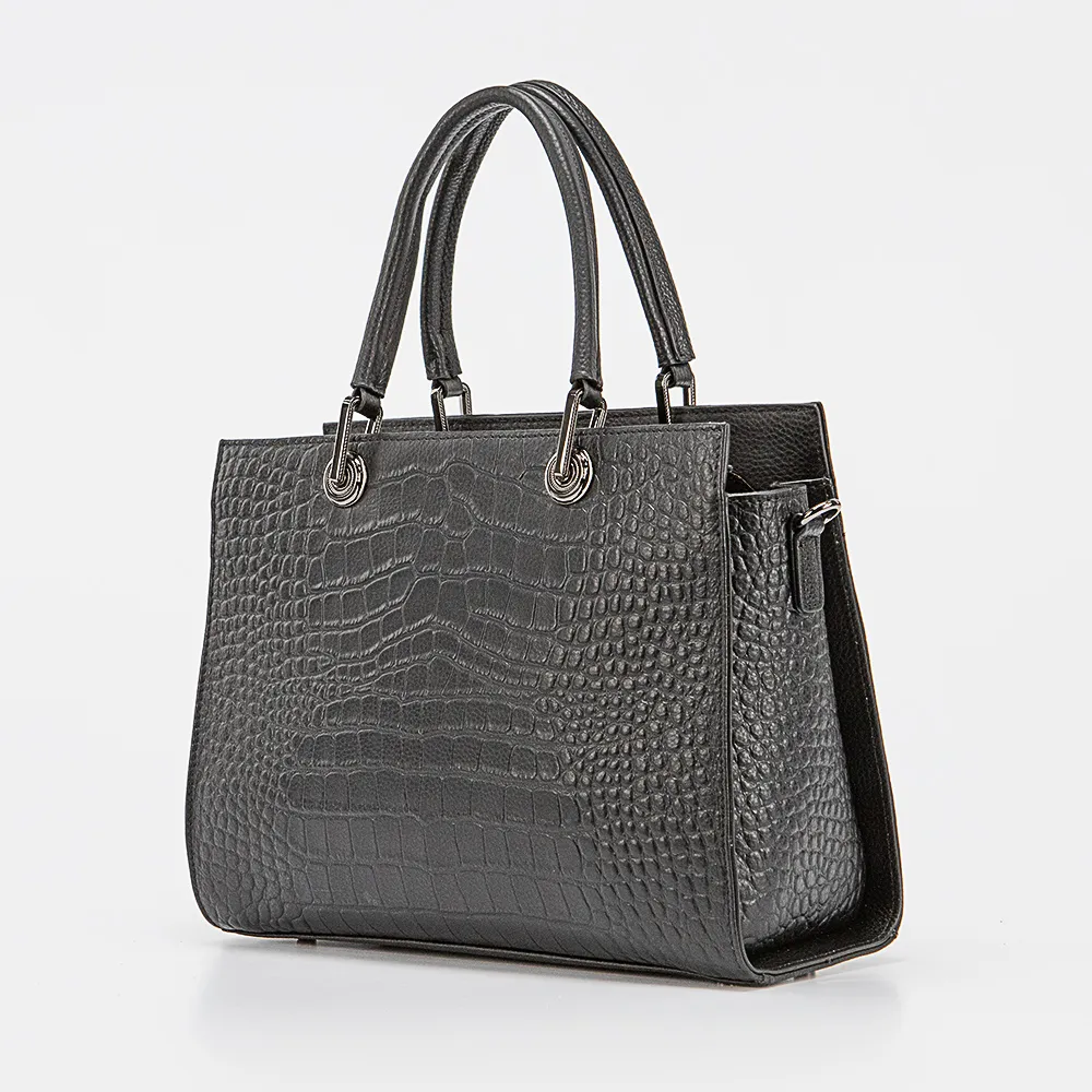 Сумка от торговой марки Poshete из натуральной кожи черного цвета с тиснением под крокодила. Модель с двумя ручками и съемным регулируемым плечевым ремнем. Отделение на молнии. Внутри: текстильная подкладка, средник и карман на молнии, накладной карман. Дно оснащено металлическими ножками для защиты от износа.