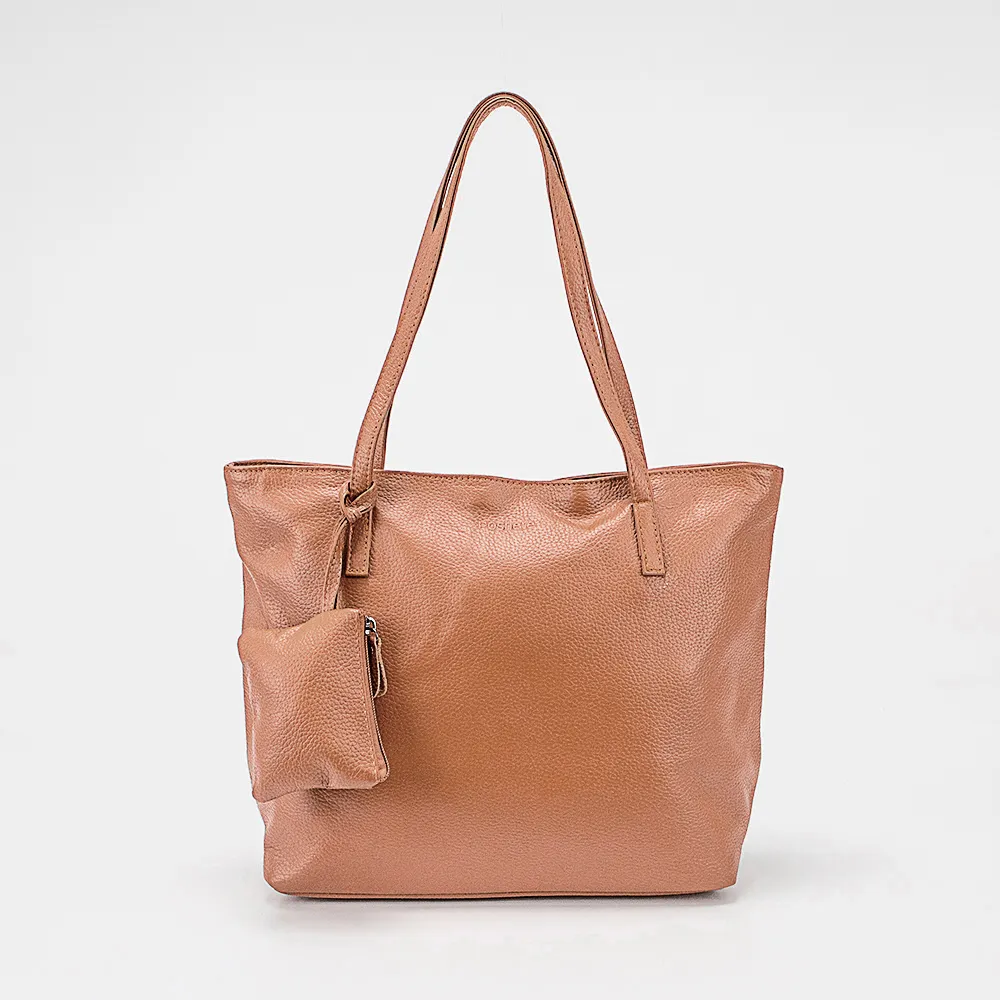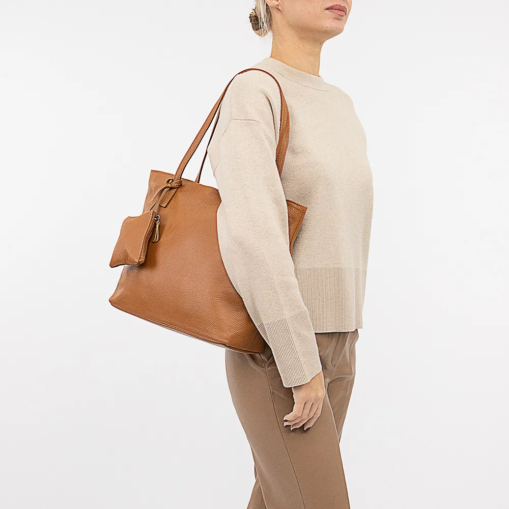 Сумка от торговой марки Poshete из натуральной кожи яркого цвета camel. Модель с двумя удлиненными ручками. Отделение на молнии. Внутри: фирменная подкладка, карман на молнии, накладной карман, перегородка с карманом на молнии, образующая накладной карман. На задней стороне – карман на молнии. В комплекте имеется кошелек с отделением на молнии и ремешком для крепления.