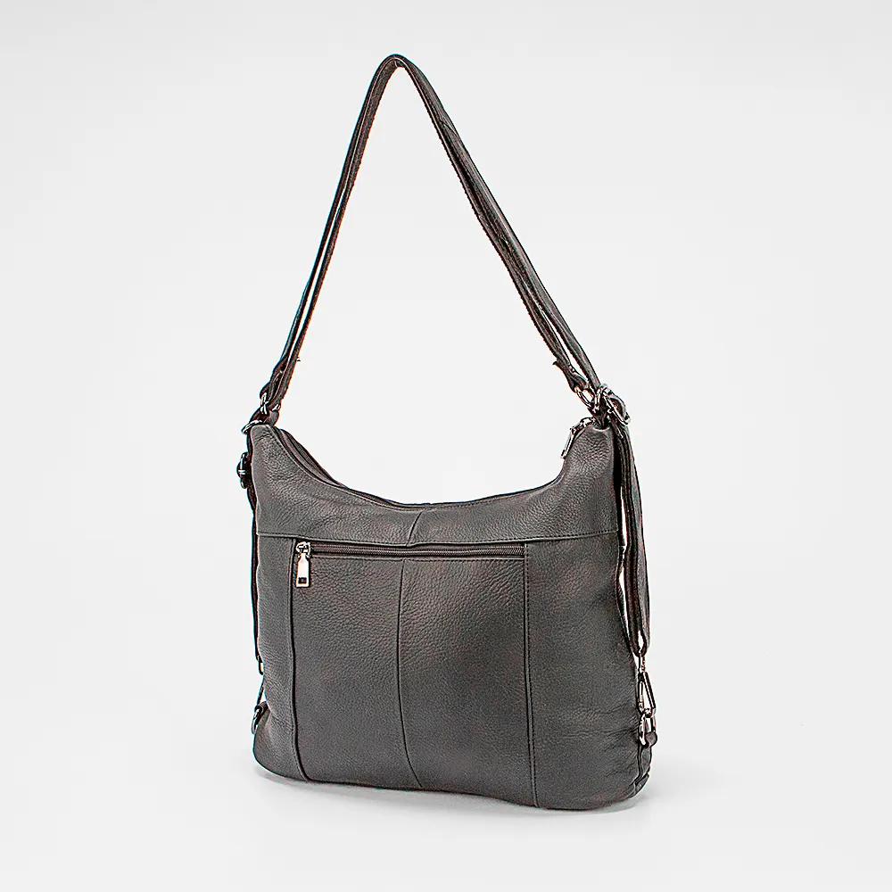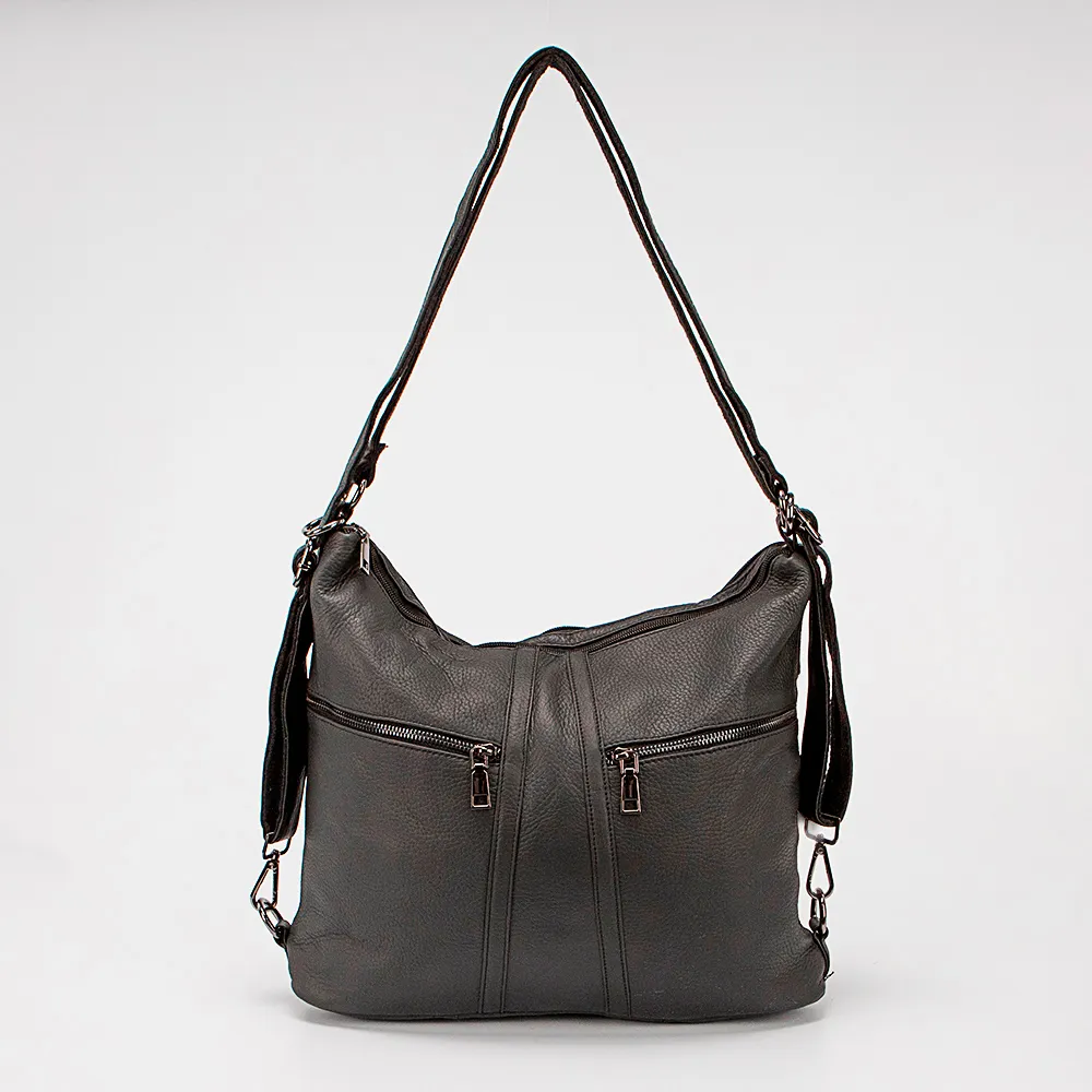 Сумка-рюкзак от торговой марки Poshete из натуральной кожи черного цвета. Модель с двумя ручками, стягиваемыми в плечевые лямки. Два отделения на молнии, с текстильной подкладкой. В одном из отделений – карман на молнии, в другом – два накладных кармана. На лицевой стороне – два кармана на молнии. На задней стороне – карман на молнии.