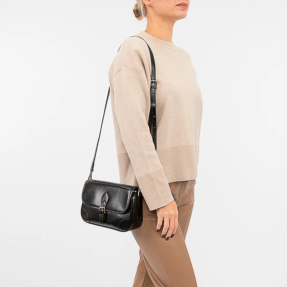 Сумка от торговой марки Poshete из натуральной кожи черного цвета. Модель со съемным регулируемым плечевым ремнем. Закрывается клапаном на магнитной кнопке; клапан декорирован ремешком. Отделение на молнии. Внутри: фирменная подкладка, карман на молнии, накладной карман. На задней стороне – карман на молнии.