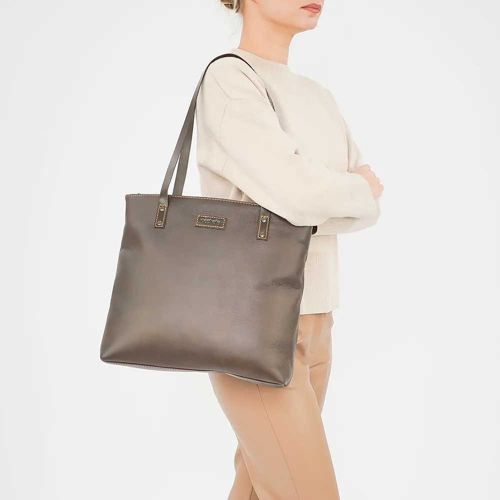 Сумка от торговой марки Poshete из натуральной кожи. Вместительная модель вертикальной ориентации, с двумя удлиненными ручками. Глубокое отделение на молнии. Внутри: фирменная подкладка, карман на молнии, два накладных кармана. На задней стороне – карман на молнии.