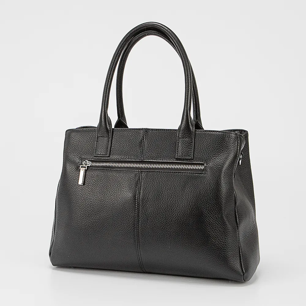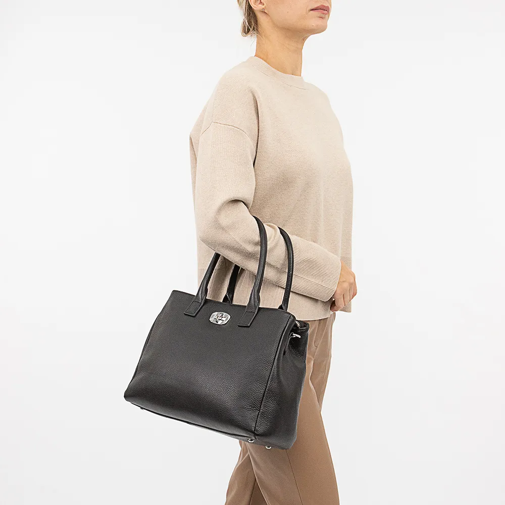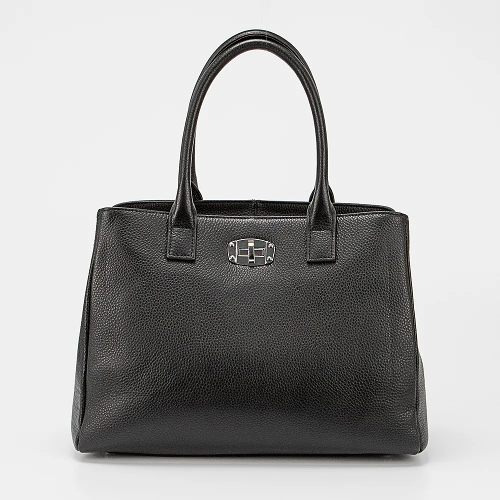 Сумка от торговой марки Francesco Molinary изготовлена из натуральной кожи черного цвета. Модель с двумя плотными ручками и съемным регулируемым плечевым ремнем. Два отделения с фирменной подкладкой. Переднее отделение закрывается поворотным замком. Основное отделение на молнии; внутри: средник с карманом на молнии, два накладных кармана. На задней стороне – карман на молнии. Дно оснащено металлическими ножками для защиты от износа.
