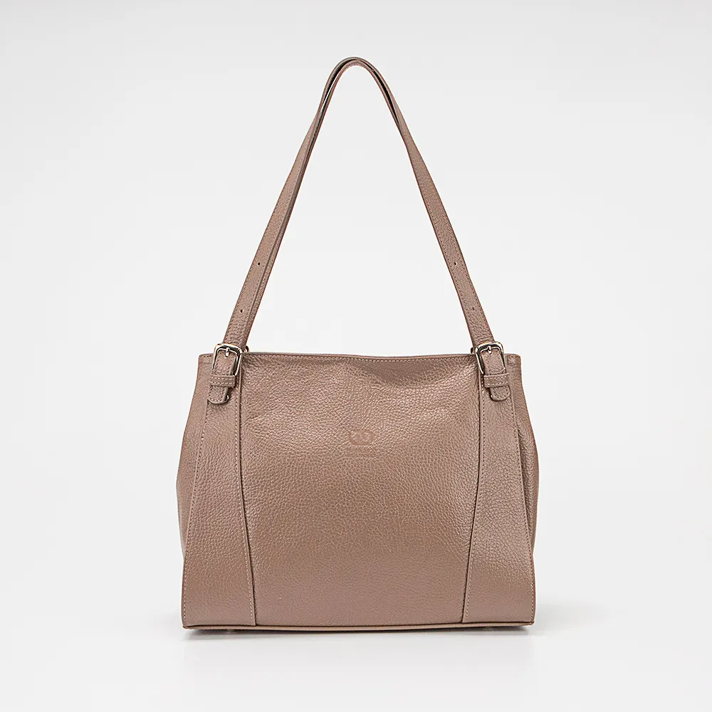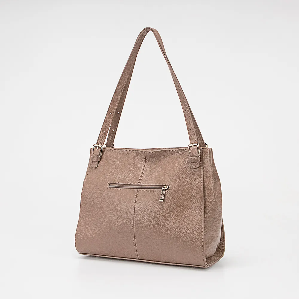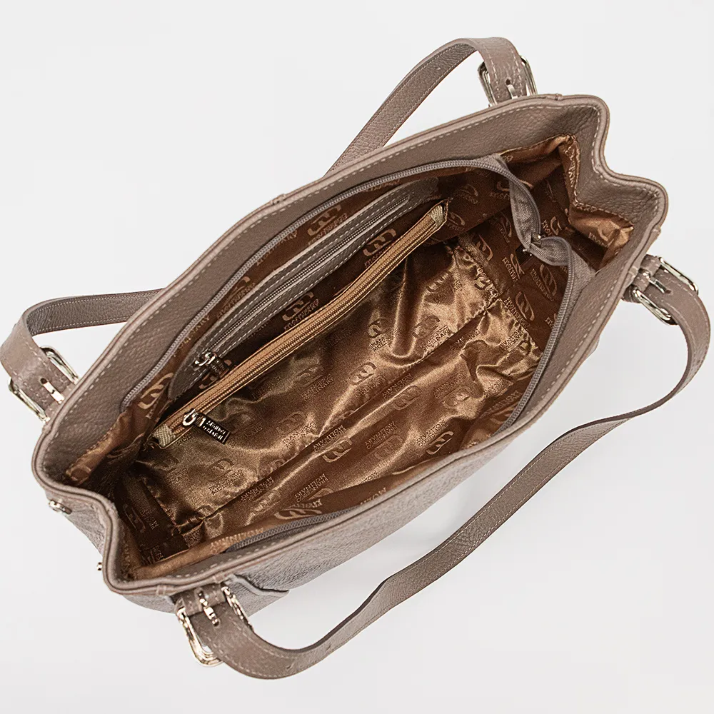 Сумка от торговой марки Francesco Molinary из натуральной кожи кофейного цвета. Модель с двумя удлиненными регулируемыми ручками. Отделение на молнии. Внутри: фирменная подкладка, два кармана на молнии, два накладных кармана. На задней стороне – карман на молнии. Дно оснащено металлическими ножками для защиты от износа.