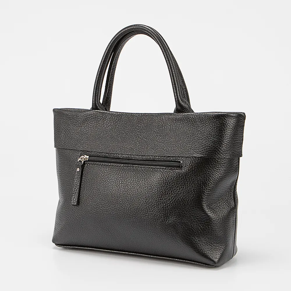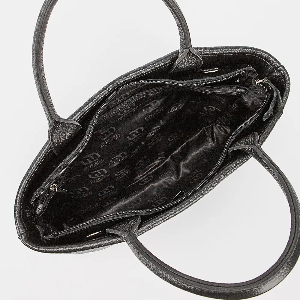 Сумка от торговой марки Francesco Molinary из натуральной кожи черного цвета. Модель с двумя ручками и съемным регулируемым плечевым ремнем. Отделение на молнии. Внутри: фирменная подкладка, средник и карман на молнии, накладной карман. На задней стороне – карман на молнии. Дно оснащено металлическими ножками для защиты от износа.