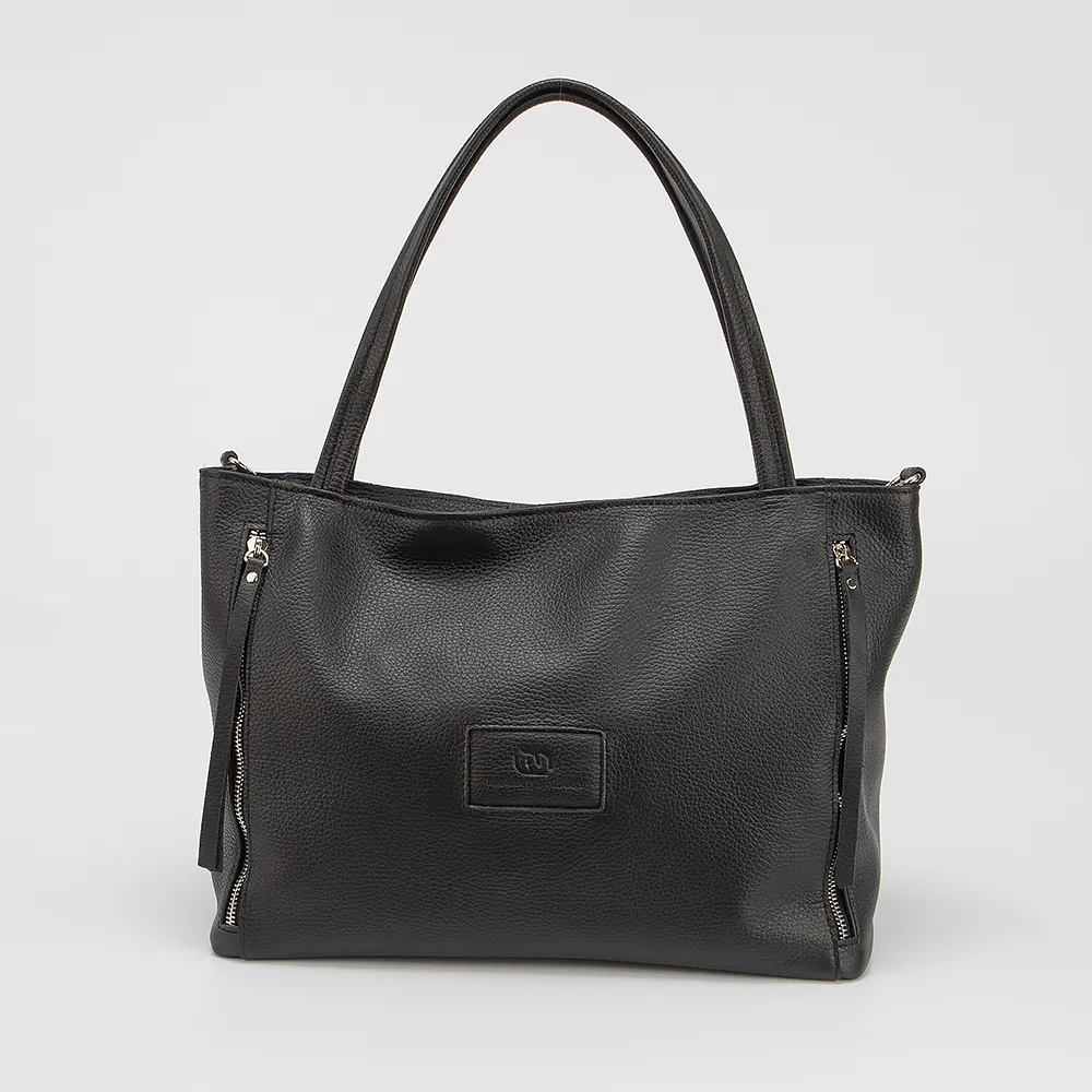 Сумка от торговой марки Francesco Molinary изготовлена из натуральной кожи черного цвета. Модель с двумя удлиненными ручками и съемным регулируемым плечевым ремнем. С лицевой стороны декорирована двумя вертикальными молниями. Отделение на молнии. Внутри: фирменная подкладка, карман и средник на молнии, накладной карман. На задней стороне - карман на молнии.
