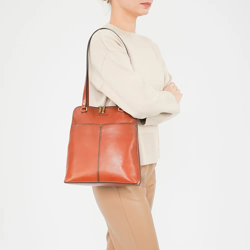 Cумка-рюкзак от торговой марки Francesco Molinary из натуральной кожи коричневого цвета. Модель с двумя удлиненными ручками, которые стягиваются в плечевые лямки. Отделение на молнии, с фирменной подкладкой. Внутри – два кармана на молнии. На лицевой стороне - накладной карман на магните. На задней стороне – карман на молнии.