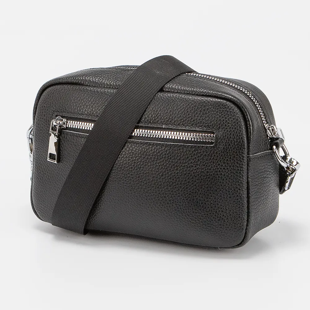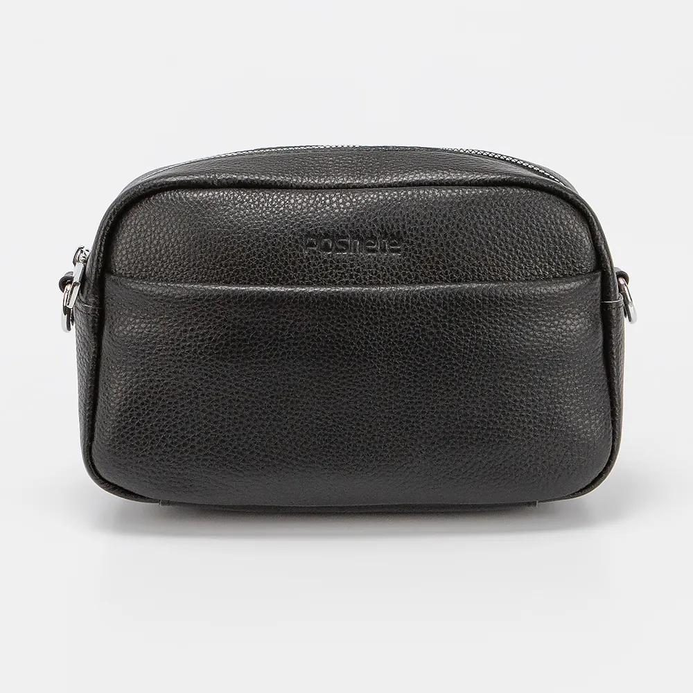 Сумка от торговой марки Poshete из натуральной кожи черного цвета. Компактная модель со съемным регулируемым плечевым ремнем. Отделение на молнии. Внутри: фирменная подкладка, карман на молнии, накладной карман. На лицевой стороне – накладной карман на магнитной кнопке. На задней стороне – карман на молнии.
