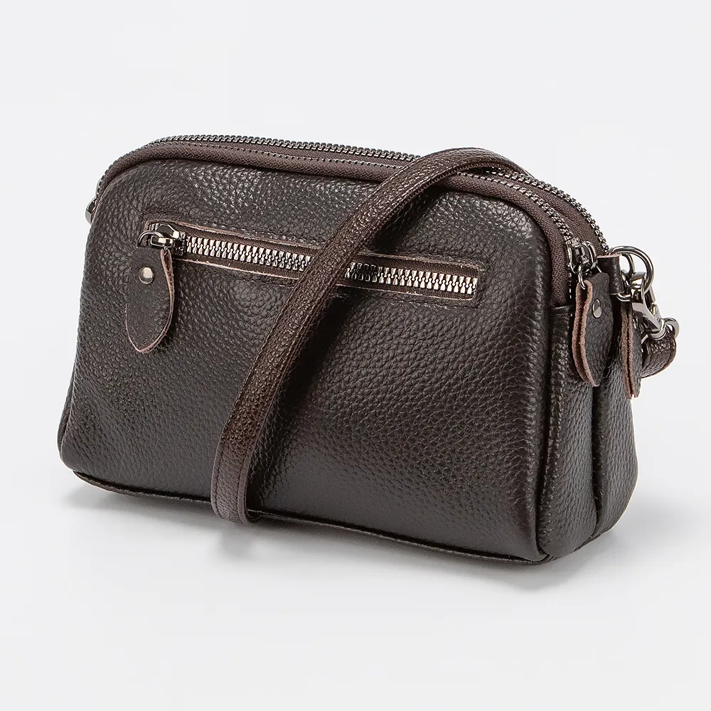 Сумка кросс-боди от торговой марки Poshete из натуральной кожи оттенков коричневого цвета. Компактная небольшая модель со съемным регулируемым плечевым ремнем. Два отделения на молнии, с фирменной подкладкой. В заднем – карман на молнии, в переднем – накладной карман. На лицевой стороне – накладной карман с хлястиком на кнопке. На задней стороне – карман на молнии.