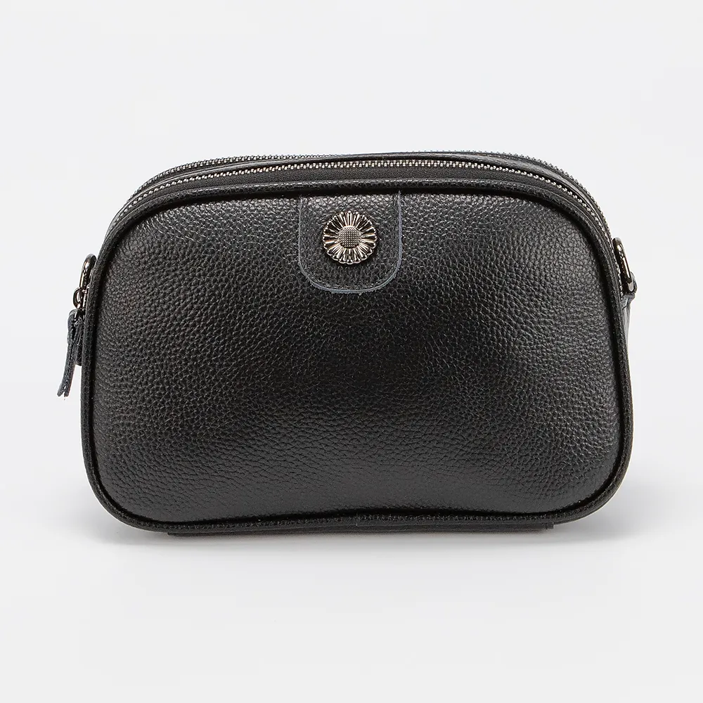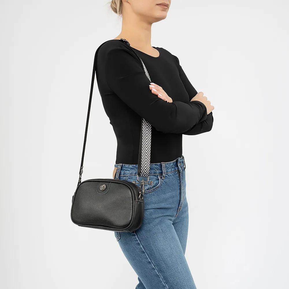 Сумка от торговой марки Poshete из натуральной кожи чёрного цвета. Модель с широким съемным регулируемым плечевым ремнем, выполненным из текстильного материала с оригинальным орнаментом. Два отделения на молнии, с фирменной подкладкой. В заднем отделении – карман на молнии. На задней стороне – карман на молнии.