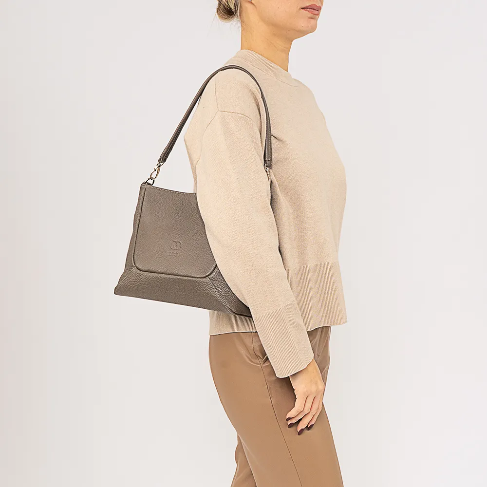 Сумка от торговой марки Francesco Molinary из натуральной кожи кофейного цвета. Модель с удлиненной съемной ручкой и съемным регулируемым плечевым ремнем. Отделение на молнии. Внутри: фирменная подкладка, карман на молнии, два накладных кармана. На задней стороне – карман на молнии.