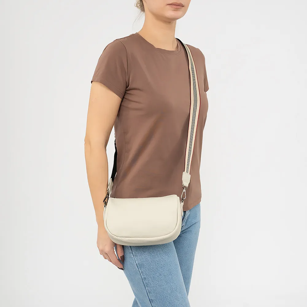 Сумка-планшет от торговой марки Poshete из натуральной кожи светло-бежевого цвета. Модель с длинным регулируемым плечевым ремнем, выполненным из текстильного материала. Отделение на молнии. Внутри фирменная подкладка, карман на молнии, накладной карман.