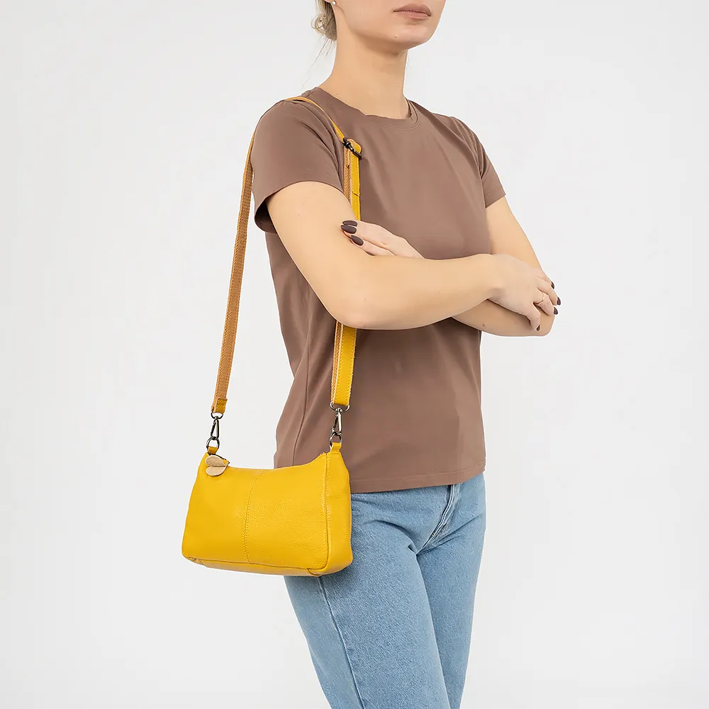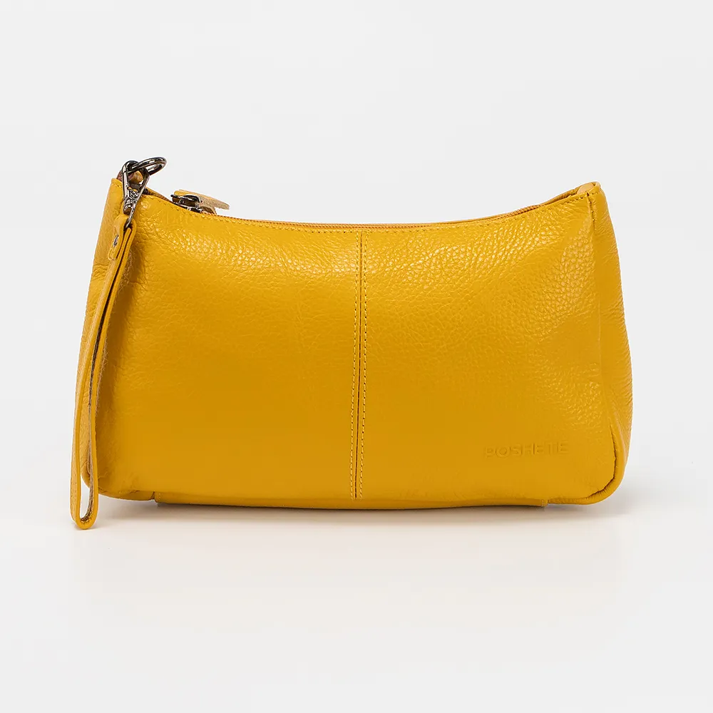 Сумка от торговой марки Poshete из натуральной кожи горчичного цвета. Модель со съемным регулируемым плечевым ремнем. Отделение на молнии. Внутри: текстильная подкладка, карман на молнии, перегородка с карманом на молнии, образующая накладной карман. Сзади карман на молнии. В комплекте имеется петля для ношения на запястье.