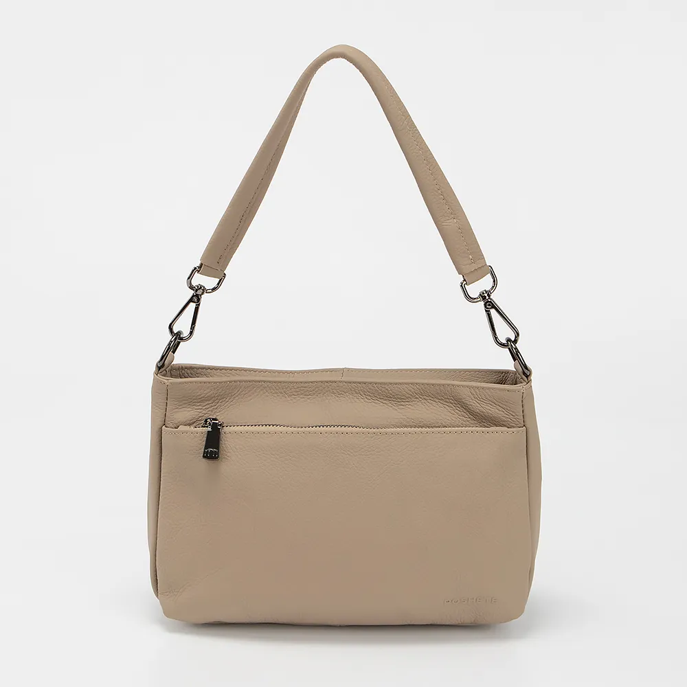 Сумка от торговой марки Poshete из натуральной кожи бежевого цвета. Модель с длинной съемной ручкой . Отделение на молнии. Внутри: текстильная подкладка, карман на молнии. На лицевой и задней стороне - накладной карман на молнии.