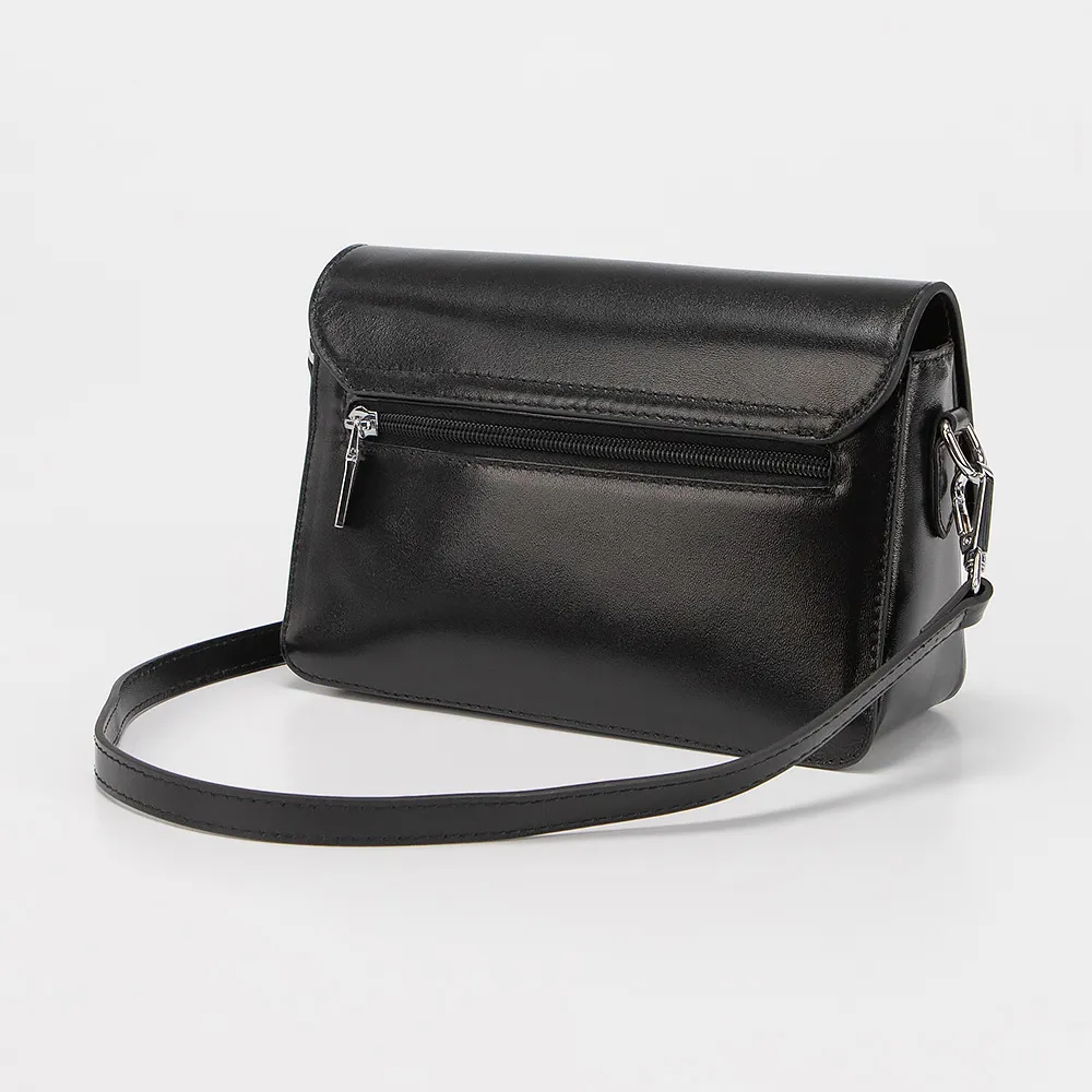 Сумка от торговой марки Poshete из натуральной кожи черного цвета. Модель со съемным плечевым ремнем. Клапан на магнитной кнопке закрывает отделение на молнии. Внутри: текстильная подкладка, карман и средник на молнии. На задней стороне – карман на молнии.