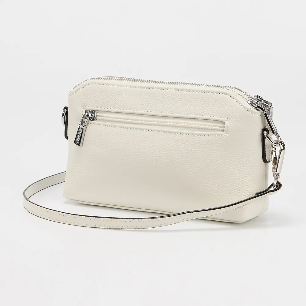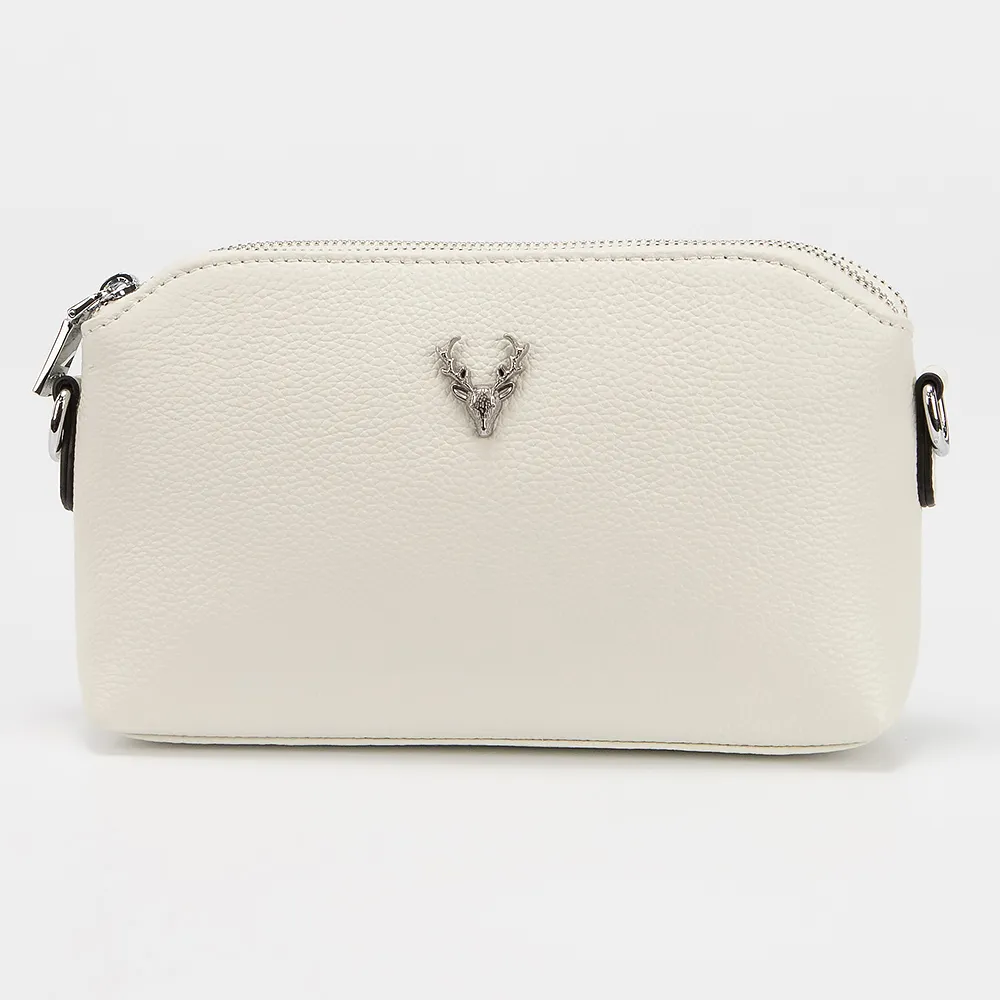 Сумка от торговой марки Poshete из натуральной кожи белого цвета. Компактная модель с узким регулируемым плечевым ремнем. Два отделения на молнии, с фирменной подкладкой. В заднем отделении - карман на молнии, в переднем - накладной карман. На задней стороне - карман на молнии. Лицевая сторона украшена декором в виде головы оленя.