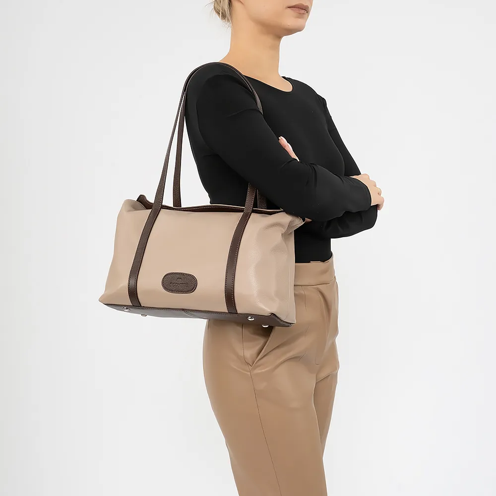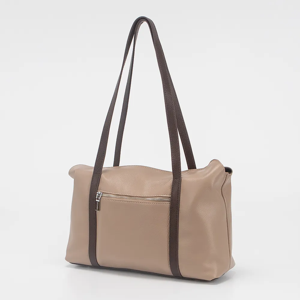 Сумка от торговой марки Poshete из натуральной кожи бежевого цвета. Компактная модель с удлиненными ручками темно-коричневого цвета. Внутри: фирменная подкладка, карман на молнии, накладной карман. На задней стороне - карман на молнии. Дно оснащено металлическими ножками для защиты от износа.