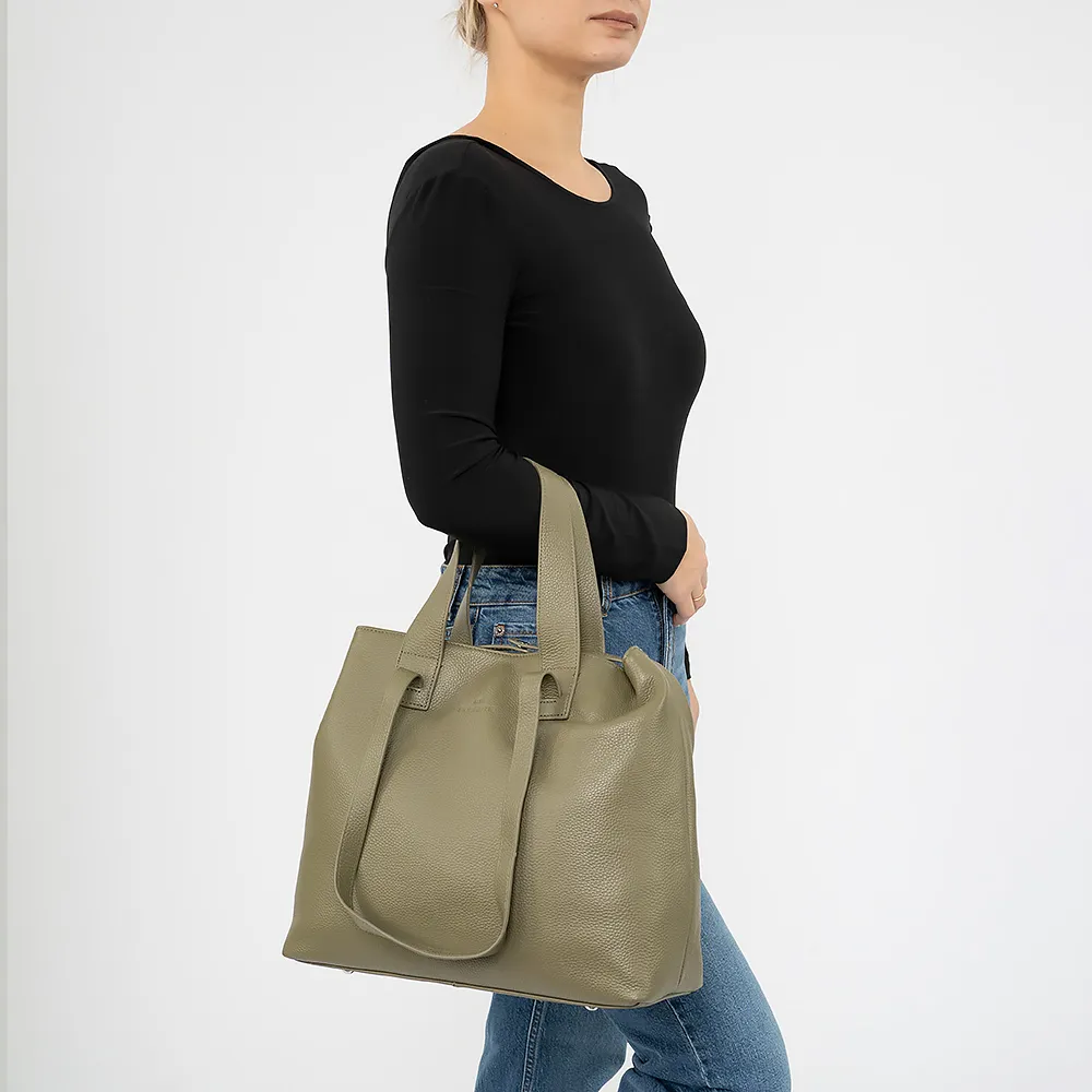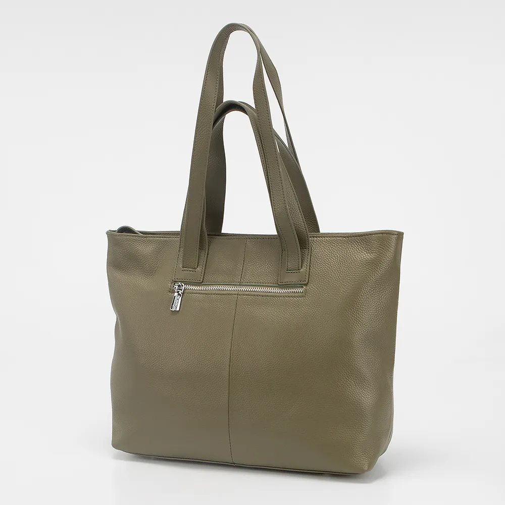 Сумка от торговой марки Poshete из натуральной кожи оливкового цвета. Модель с двумя длинными и двумя короткими ручками. Отделение на молнии и на магнитной кнопке. Дополнительно предусмотрены тонкие ремешки на кнопке для придания оригинальной формы сумке. Внутри: фирменная подкладка, карман на молнии, накладной карман. Сзади карман на молнии. Дно оснащено металлическими ножками для защиты от износа.